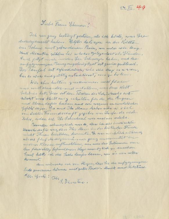 Superb Albert Einstein autograph letter signed. Single page, quarto, written in German, dated 27 December [1949]. Written to “Frau Ehrman,” wife of Dr. Ehrman, Einstein’s Berlin doctor who emigrated to New York before World War II. Einstein pens in part: “Dear Mrs. Ehrman, / I was completely filled with consternation yesterday when I heard what you went through. Helplessly lying in the cold snow with a broken leg for who knows how long, minutes passing like hours. You will continue to have pain, and the enforced immobility is certainly cruel. The devil is creative, as the Nazis were when it was finally decided to round us up. But we hold together and take pleasure with each other and with everyone in that which is beyond the fickleness of fate and remains forever present for those who have the eyes and the ears for it and a warm human sensibility. You and your husband have given me so much friendship over the course of many years that I experience your fate as my own. It was particularly painful that I was the reason that your husband couldn’t be at your side at the critical hour. It was truly surprising the way the five medicine men appeared in my room totally unexpectedly…Otherwise I would have let the matter take its own course. Now I wish from my heart that you can enjoy your enforced peace and quiet with good radio music and books. / Best wishes, / A. Einstein.” Albert Einstein maintained lifelong friendships with his old acquaintances and kept them near to him throughout his tumultuous life. Of particular interest is the fact that this letter is in his own hand, not written by a secretary. He wished to personally comfort his friend and acknowledge his feelings of responsibility for keeping her husband from her during a time of need. This is not the first time that Einstein used the Devil metaphorically. On declining a piece of chocolate at dinner one night [on the advice of Dr. Ehrman], Einstein was heard to say “The devil has put a penalty on all things we enjoy in life. Either we suffer in our health, or we suffer in our soul, or we get fat.” Wonderful content. Fine condition.
