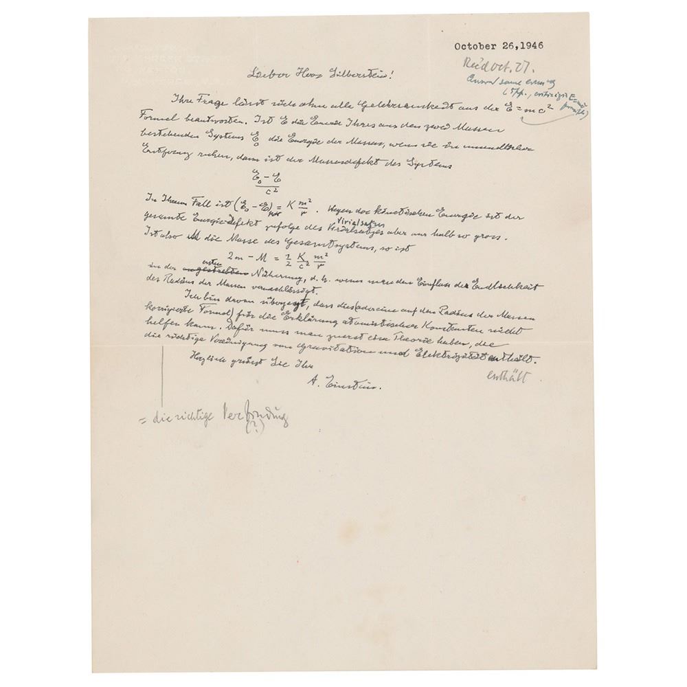 ALS in German, signed “A. Einstein,” one page, 8.5 x 11, blindstamped personal Princeton letterhead, October 26, 1946. Handwritten letter to Dr. Ludwik Silberstein, with his most famous equation, "E = mc2," penned in the first line in his own hand. In full (translated): "Your question can be answered from the E = mc2 formula, without any erudition. If E is the energy of your system consisting of the two masses, E0 the energy of the masses when they approach infinite distance, then the system’s mass defect is E0 - E / c2.