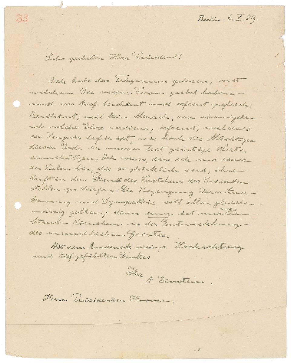 Einstein here acknowledges Hoover’s telegram with great humility—declaring that he himself is “but a grain of dust in the development of the human spirit” and magnanimously sharing the recognition bestowed upon him with the entirety of the world scientific community—writing in full (translated): “Very learned Mr. President, I have read the telegram with which you have honored me, and I was both profoundly humbled and elated. Humbled, because no person, I least of all, is worthy of such an honor; elated, because this is proof of how highly the powers-that-be of this earth esteem intellectual values in our time. I know that I am just one of the many who are so happy to use their energy in the service of the understanding of the Sciences. Your testimony of recognition and congeniality shall refer to all of us equally; because I alone am but a grain of dust in the development of the human spirit. With the expression of my respect and deeply felt thanks, Yours, A. Einstein” In fine condition, with two punch holes to left side, small tears along edges, and a crease in the lower blank area.