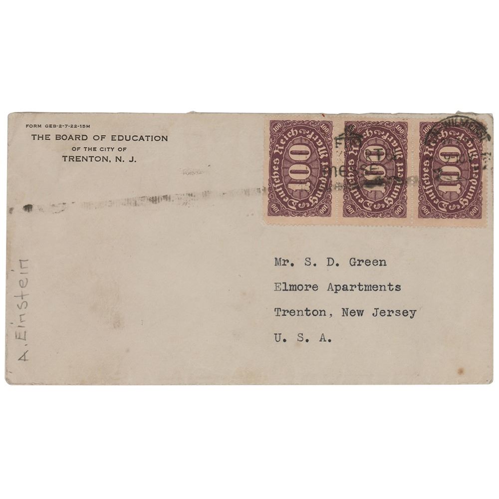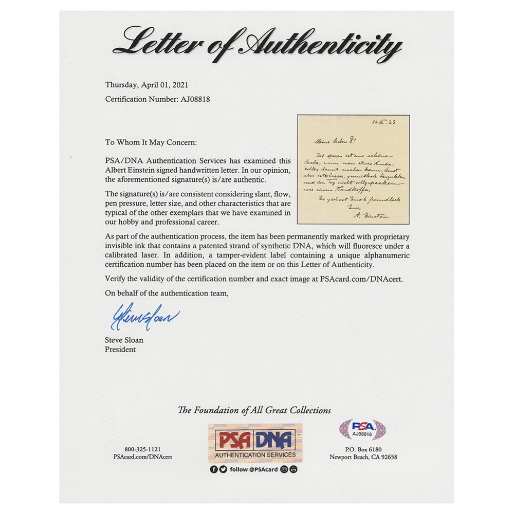 ALS in German, signed “A. Einstein,†one page, 5 x 6.75, March 26, 1923. Handwritten response to a solicitation for life advice from an American educator, in full (translated): "To save time is a wonderful quest if a person is able to make something wonderful out of it. Otherwise it's better to sit back and live comfortably and to be sure not to pack it with too many things to do as you would overpack your briefcase." In very good to fine condition, with light dampstaining and associated wrinkling to the top and bottom edges, not affecting the main body of text. Accompanied by the original mailing envelope and a full letter of authenticity from PSA/DNA.