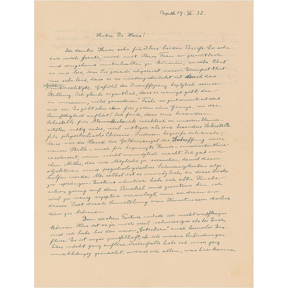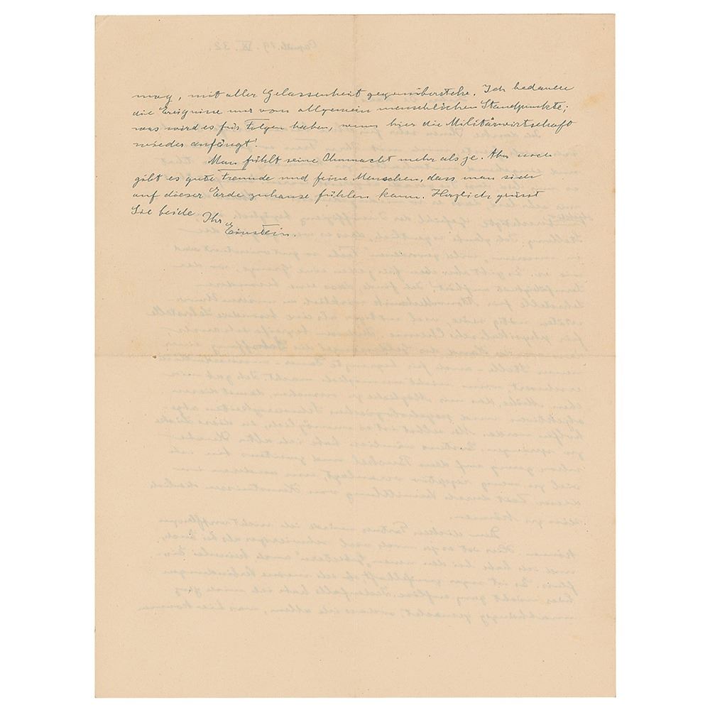 ALS in German, signed “Einstein,†one page both sides, 8.25 x 10.75, September 19, 1932. Written from his summer house in Caputh, a letter to "De Haus," in full (translated): "I thank you greatly for the letters from both of you. The happier I am to be able to pass the time so cheerfully and closely with your wife, the more it makes me sorry that you had just gone away. Ehrenfest makes me very sorry that he is so depressed through his feeling of insufficiency with regard to his post, which is objectively unjustified. I actually believe that there are a few people who will be as well orientated as he will in our 'law of the jungle' department. Still, for everybody there is a limit where ability to learn comes to an end. I find that a special teaching post for atomic mechanics would be necessary in our universities; much more necessary than a teaching post for physical chemistry. Meanwhile, I also suppose that, for the present, the shortage of funds is making the creation of a new post, even for a limited duration, extraordinarily difficult, if not impossible. I even took the trouble to try what I could, so that these objective and psychological difficulties might be removed. It is impossible for me personally to jump into this gap. First, being an old boy, I already have enough on my back, and secondly I am much too little receptively skilled to be able to be serviceable to others at this time by the transmission of bits of knowledge. I would not be able to transplant the thick Partner. Here, it is yet more difficult than with you, and I also have no kind of influence with the new 'Governors.' It is even doubtful whether I do not altogether end my connections here. In any case, I have made myself quite independent, so that I may face anything that may come here with all composure. I regret the things that have happened to me from general human standpoints; what will there be as results, if the military economy starts again here! We feel our helplessness more than ever. Still, there are still good friends and fine people, so that we can feel at home on this earth. Heart greetings to you both." In fine condition.