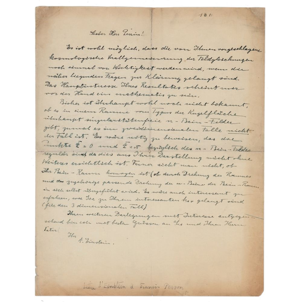 ALS in German, signed “A. Einstein,” one page, 8.5 x 10.75, no date. Handwritten letter to French physicist, Francis Perrin, the son of Nobel prize-winning physicist Jean Perrin, in full (translated): "It is quite possible that the cosmological generalization of the questions of fields that you propose will become important again when the questions closest to it have been resolved. The main interest of your result seems to me for the moment to be of a mathematical nature. Until now, it is still not known if in a spherical-like space there exist n-Bein-like fields free from singularities, especially since this is not the case in a two-dimensional space. It would be necessary to prove that the points PHI=0 and PHI=pi are regular with respect to the n-Bein field, because it does not appear clearly in your diagram. Moreover, we do not see if the space is homogeneous (if by a rotation of the space and a corresponding rotation of n-Bein, this n-Bein space is transferred into itself). It would also be interesting to know how you arrived at your interesting hsv (for the three-dimensional case). I look forward to your further explanations. Greetings to you and your father." In very good to fine condition, with light creasing and toning to the edges, and silking on the back for reinforcement.
