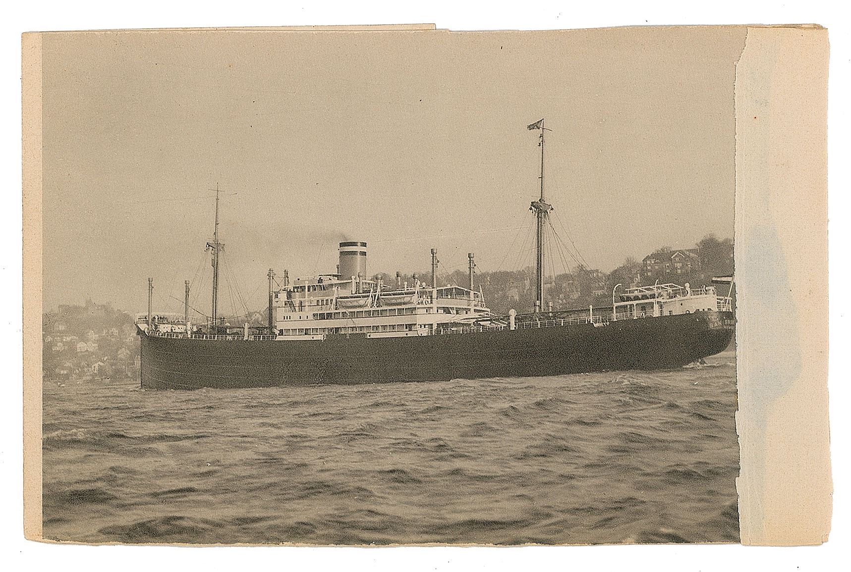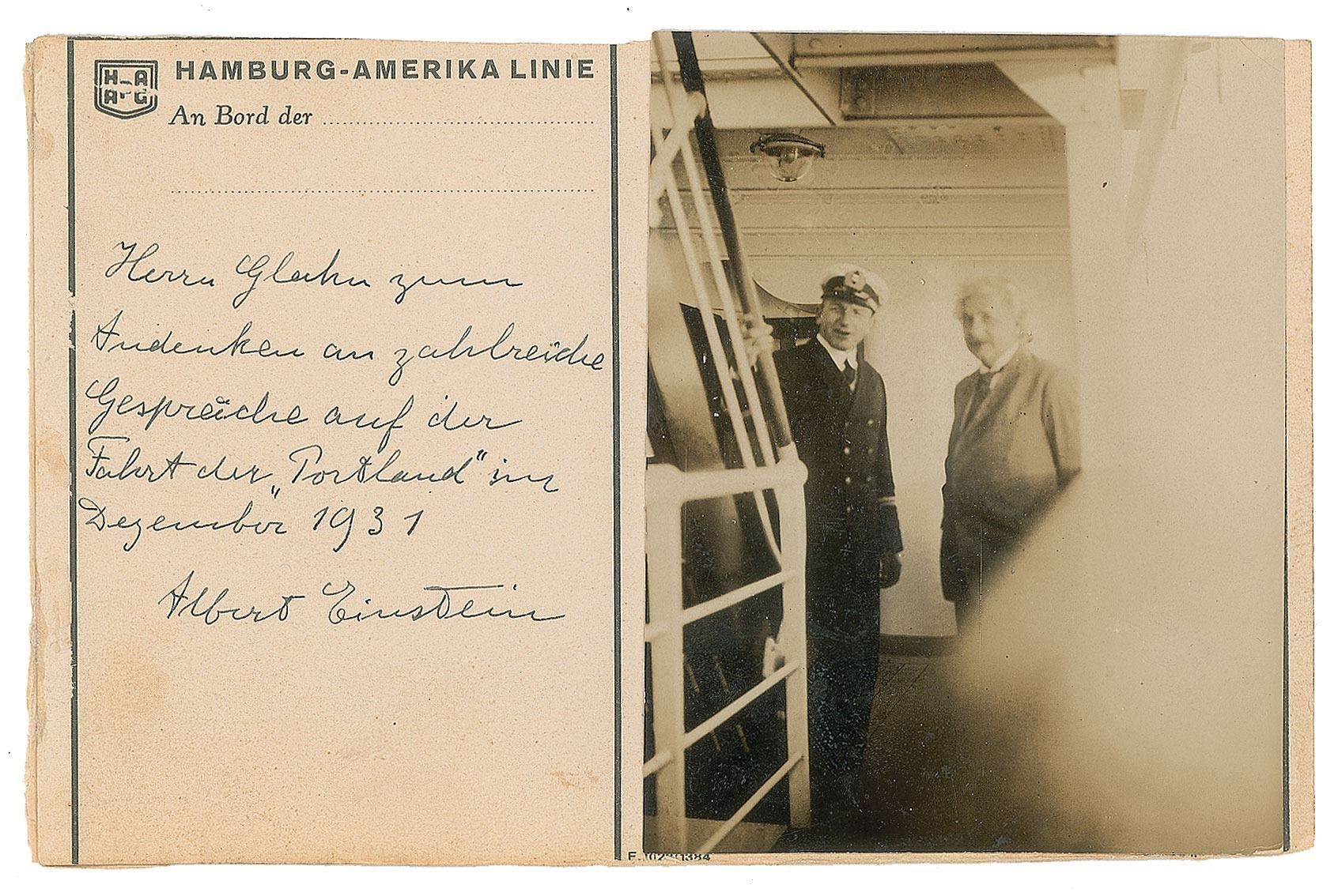 ANS in German, signed in full, “Albert Einstein,” one page on a 5.75 x 3.75 Hamburg-Amerika Linie postcard, December 1931. Einstein thanks the captain of the steamship “Portland” he has traveled on for the many conversations. A candid photograph of Einstein and the captain is affixed to the right side; the front of the postcard depicts a Hamburg-America line ship, likely the Portland. The Portland was in fact the boat Einstein took to travel to Cal Tech. In very good to fine condition, with some trivial surface loss along the left edge.
