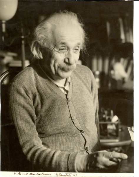 Albert Einstein Vintage matte-finish 7 x 9.25 casual photo of Einstein in his study, signed and inscribed in the lower border in fountain pen “To Mr. and Mrs. Ken Browne, A. Einstein. 51.” In very good condition, with lightly trimmed edges, two vertical creases passing through image lightly affecting a small portion of signature, and a few other creases to background. A one-of-a-kind pose that we have never seen before.