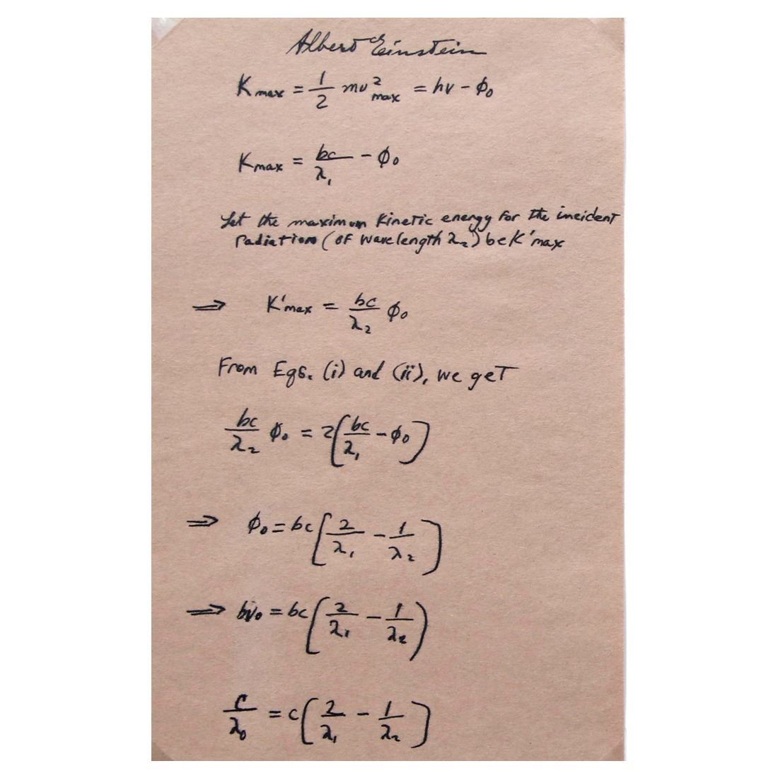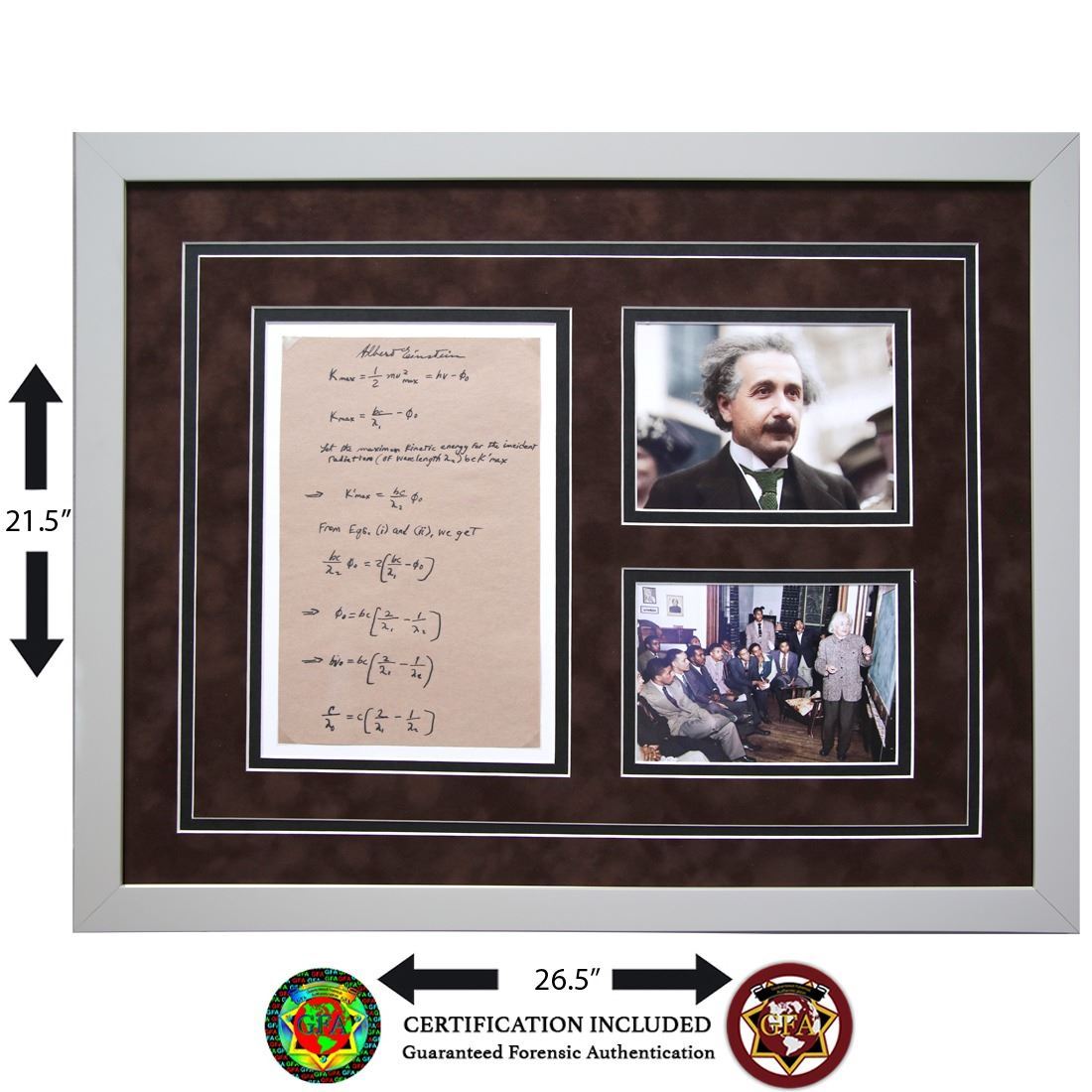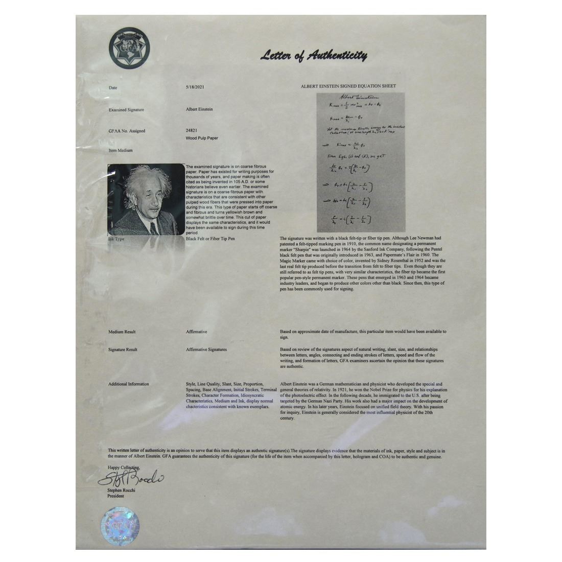 Albert Einstein (1879-1955) signed Equation Page. A Boldly signed autograph in black ink of the Nobel Prize laureate with a handwritten equation. Albert Einstein was a German mathematician and physicist who developed the special and general theories of relativity. In 1921, he won the Nobel Prize for physics for his explanation of the photoelectric effect. In the following decade, he immigrated to the U.S. after being targeted by the German Nazi Party. His work also had a major impact on the development of atomic energy. In his later years, Einstein focused on unified field theory. With his passion for inquiry, Einstein is generally considered the most influential physicist of the 20thcentur. Professionally custom Matted and Framed. Comes with a Letter of Authentication from Guaranteed Forensic Authenticators (GFA), along with the GFA guarantee of authenticity.