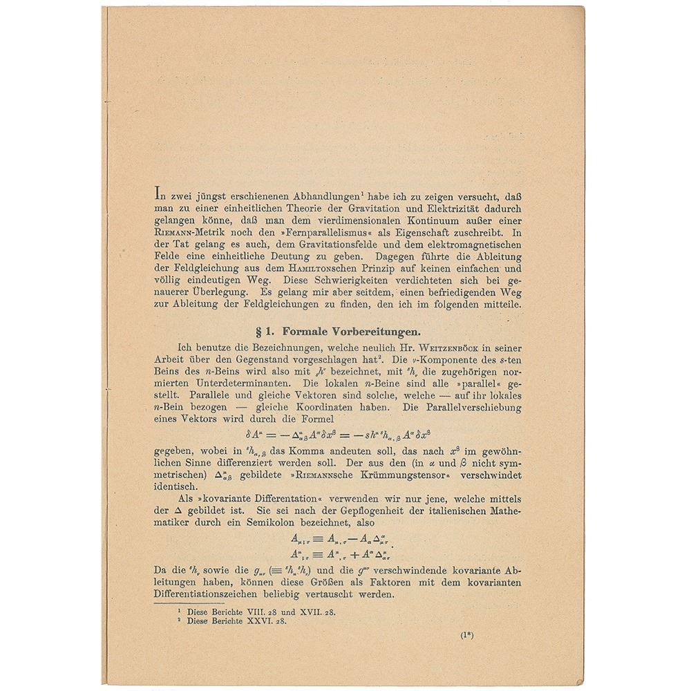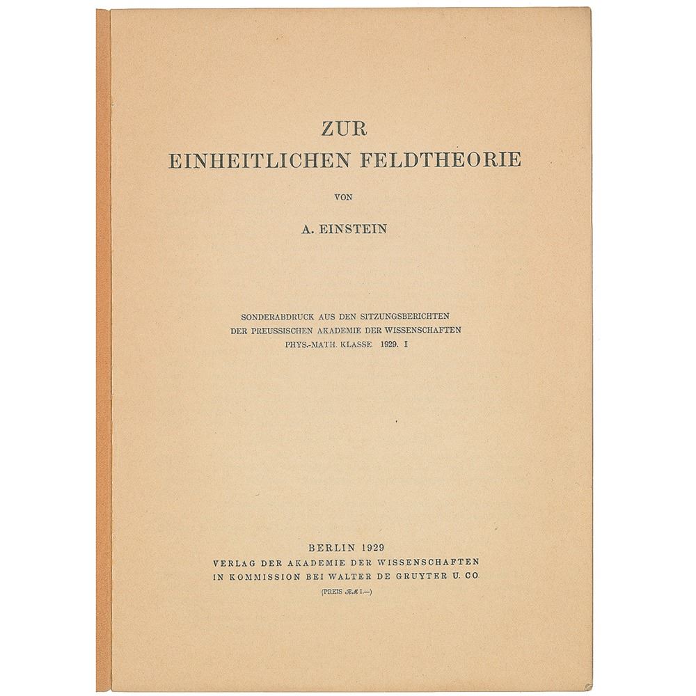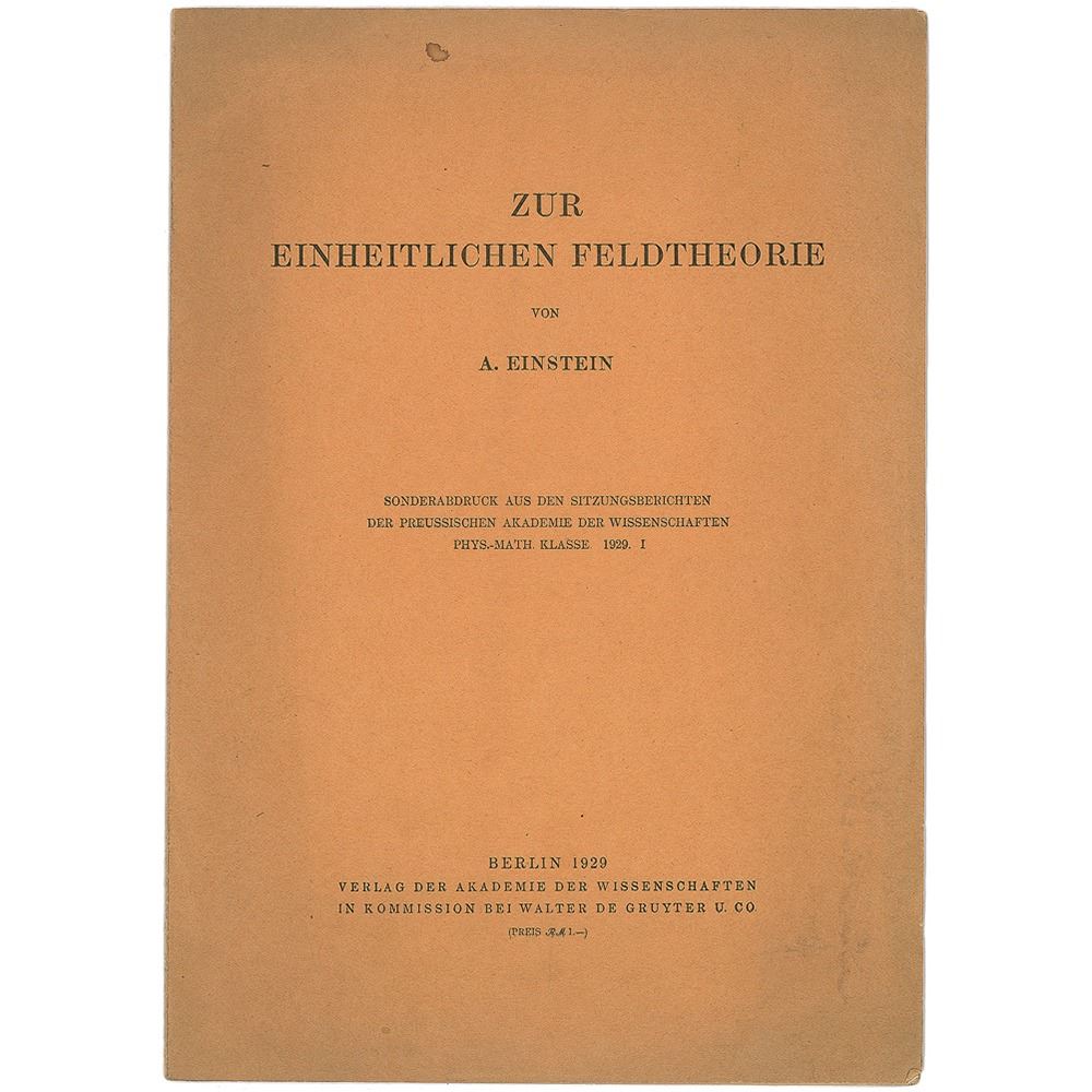 Rare unsigned booklet: Zur Einheitlichen Feldtheorie [On the Unified Field Theory]. First edition of one of Einstein's last important scientific works. Berlin: Walter de Gruyter, 1929. Original orange printed wrappers, 7.25 x 10.25, 8 pages. In very good to fine condition, with light handling wear, and toning to the covers. By 1929, Einstein had solved the main problems he had faced in writing field equations for his unified field theory; this 'united field' theory would be a generalization of his gravitational theory, including all electromagnetic phenomena.