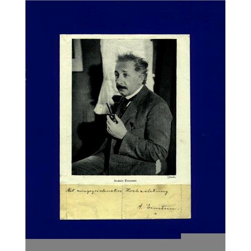 Albert Einstein. One of the great intellects of modern times, his Theory of Relativity (1905) and theories of light and gravity now considered basic physics; awarded Nobel Prize for Physics, 1922. Photo by Jacobi from a publication, 5 x 6, showing Einstein at about age 40, holding a pipe. Mounted below, 1 1/4 x 5 slip, bearing three-word greeting in his hand, with signature "A. Einstein," in watery blue ink. Original folds in holograph, else very good. Photo tipped to royal blue board, 8 x 10.