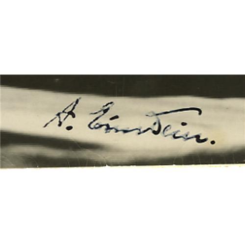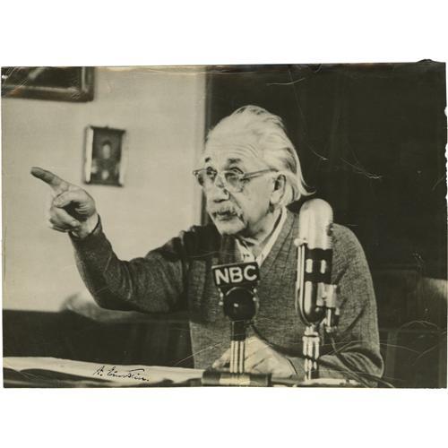 <B>Albert Einstein Photo Signed</B></I> "<I>A. Einstein</B></I>". A B&W 8" x 5.75" photo taken when Einstein appeared on an NBC program called "Today With Mrs. Roosevelt." It was on this show that Einstein discussed the U.S. Government's plan to build hydrogen bombs far more powerful than the bombs dropped on Hiroshima and Nagasaki. His speech included comments as follows: "The idea of achieving security through national armament is, at the present state of military technique, a disastrous illusion...The armament race between the U.S.A. and the U.S.S.R., originally supposed to be a preventive measure, assumes hysterical character...The hydrogen bomb appears on the public horizon as a probably attainable goal. Its accelerated development has been solemnly proclaimed by the President. If it is successful, radioactive poisoning of the atmosphere and hence annihilation of any life on earth has been brought within the range of technical possibilities..." This photo has some creasing but is generally fine. A fine memento of an historic and passionate speech by one of the twentieth century's greatest scientists.<BR><BR><b>Shipping:</b> Flat Material, Small (<a target="_blank" href="http://www.heritageauctions.com/common/shipping.php">view shipping information</a>)