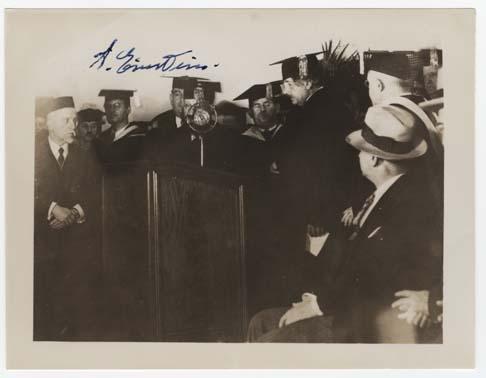 Excellent photograph signed ''A. Einstein'', taken on 8 October 1934 at the podium at then Yeshiva College, the day Einstein received the Honorary Degree of Doctor of Humane Letters. In his acceptance address, Dr. Einstein said, ''I believe that the Jewish love for the spiritual which constitutes the most valuable element in the Jewish community, is apt to disintegrate under present circumstances, under the influence of the general life-philosophy of our time, which is directed toward materialistic conceptions…The Jewish people has sustained through 2,000 years of severe hardships because it has regarded a tradition of love for the spiritual and the moral as its highest possession. Not external success but a deep, spiritual perception of life has been considered as the most desirable attainment…'' Just a year before Einstein gave this speech, and ten months after Hitler became German Chancellor, Einstein had left England for the United States, announcing he had decided not to return to Germany and to never again enter German ground. He never did. Black and white photo measures 3.75'' x 2.75''. Near fine condition.