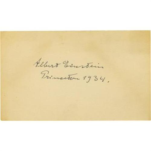 <B>Albert Einstein Signature</B></I> on a 5" x 3" card to which he has added "<I>Princeton 1934</B></I>." In the middle of March 1933, Einstein and his wife Elsa were on their way back to Europe after two months in the United States when they heard of Hitler's rise to power; they decided to not ever return to Germany. Later that year, Einstein moved to Princeton where he would live and work until his death in 1955. Some toning, else fine.<BR><BR><b>Shipping:</b> Flat Material, Small (<a target="_blank" href="http://www.heritageauctions.com/common/shipping.php">view shipping information</a>)