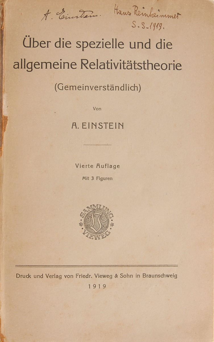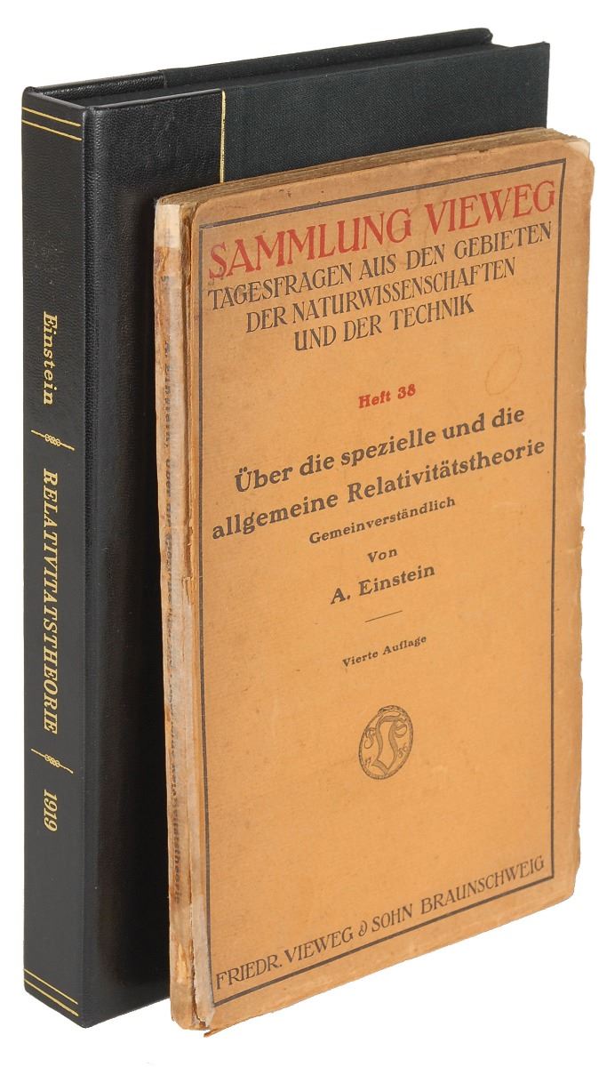 Signed book: Uber die spezielle und die allgemeine Relativitatstheorie [The Special and the General Theory of Relativity]. Fourth edition. Braunschweig: Friedr. Vieweg & Sohn, 1919. Softcover, 5.75 x 9, 83 pages. Signed on the title page in fountain pen, “A. Einstein.” Also bears an ownership signature to the right of Einstein’s. Autographic condition: fine. Book condition: G+/None, with detached front wrapper. Accompanied by a custom quarter-leather clamshell case.