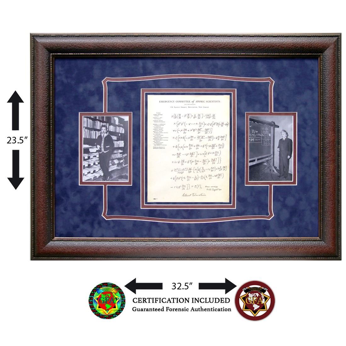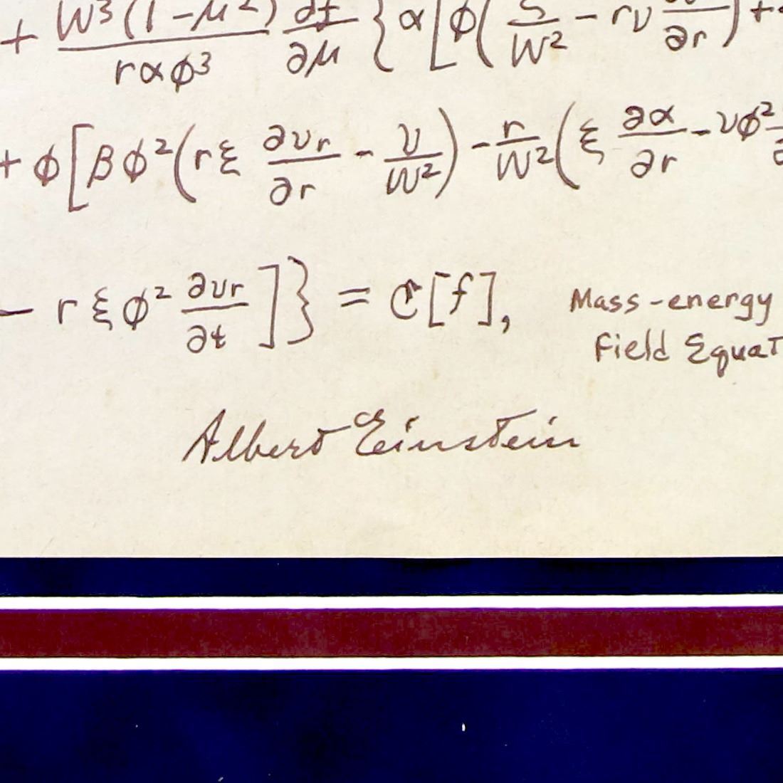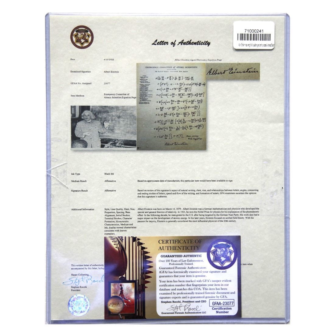 Albert Einstein (1879-1955) signed Equation on his personal stationary. By taking up the work of two 19th century physicists (Morley and Michelson), Albert Einstein made this amazing discovery that in fact the laws of physics are the same everywhere. And all of that, regardless of the reference. More surprisingly, the movement would slow down time. An interesting example to illustrate this is that of space travelers moving at the speed of light, which would return to Earth after a year. While the latter have aged a year (the duration of their journey), the Earth would have undergone a much greater aging. In simpler terms: it has been proven that by moving at the speed of light, 1 second for you would be equal to approximately 1 minute for a motionless observer. Albert Einstein's genius was to resonate on a much grander scale than on a human one. Indeed, on Earth, the speed of human movement is too low to observe even the slightest variation of time. Yet, taking as his starting point the speed of light, he had set up the notion of relativity in physics and questioned the absolute nature of space and time. Thus, from this original postulate, he deduced that the velocity of a matter (as small as it may be) can cause great damage if it is launched at a great pace (using the famous equation E = MC²). The military and nuclear scientists quickly understood how to use this type of invention, and thus the atomic bomb was born. Today, we have learned how to tame this discovery to develop nuclear energy. This item has been professionally custom matted and framed. Comes with a Letter of Authentication from Guaranteed Forensic Authenticators, along with the GFA guarantee of authenticity.