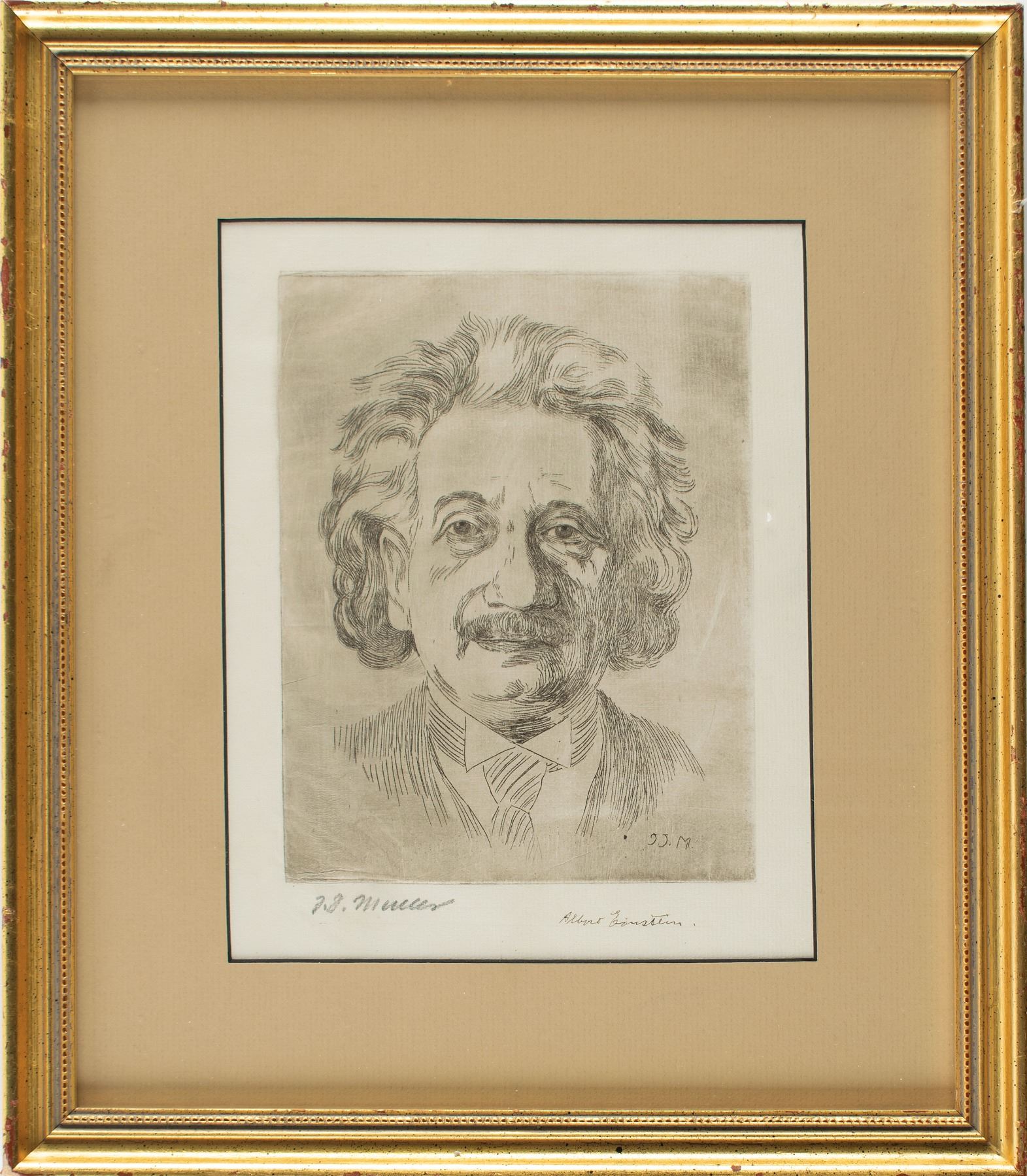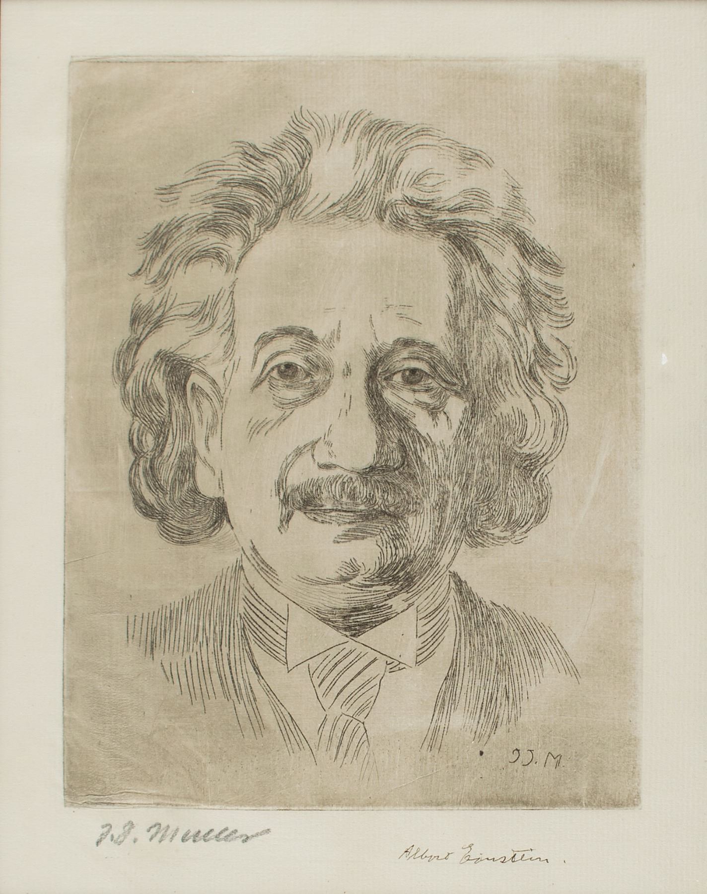 Striking circa 1934 portrait etching of Einstein by J. J. Muller, 7.5 x 9.5, signed in the lower border in fountain pen by the genius subject, "Albert Einstein," and in pencil by the artist, "J. J. Muller." Attractively matted and framed to an overall size of 12.75 x 14.75. In fine condition. A fantastic portrait of Einstein, created by a well-regarded printmaker active in Germany during the Weimar period.