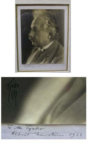 Beautiful pair of signed and inscribed sepia-toned gelatin silver portrait prints of Albert Einstein and his wife Elsa, taken in Los Angeles by photographer Aaron Tycko in 1932. Einstein inscribes his photo on bottom mount, ''To Mr. Tycko / Albert Einstein. 1932.'' Framed and matted with a calligraphed Einstein quote, ''If my theory of relativity is proven successful, Germany will claim me as a German and France will declare that I am a citizen of the world. Should my theory prove untrue, France would say I am a German and Germany will declare that I am a Jew.'' Photograph measures 8.5'' x 11'', framed to an overall size of 18'' x 29''. Light silvering along margins of photo, else fine. Elsa's photo is inscribed on bottom mount in German and signed ''Elsa Einstein.'' 9'' x 9'' image mounted on a 10'' x 13.5'' mat and framed to an overall size of 17'' x 20''. Lower corner crease and light silvering of background not affecting the portrait image, else fine. Interestingly, the photographer Aaron Tycko was interviewed by the FBI which inquired about both his and Einstein's connections with Communist sympathizers, as a result of these photo sessions. Both Tycko and Einstein had met with Charlie Chaplin while Einstein was in Los Angeles during the photo shoot, and Chaplin was, of course, believed to have Communist sympathies.