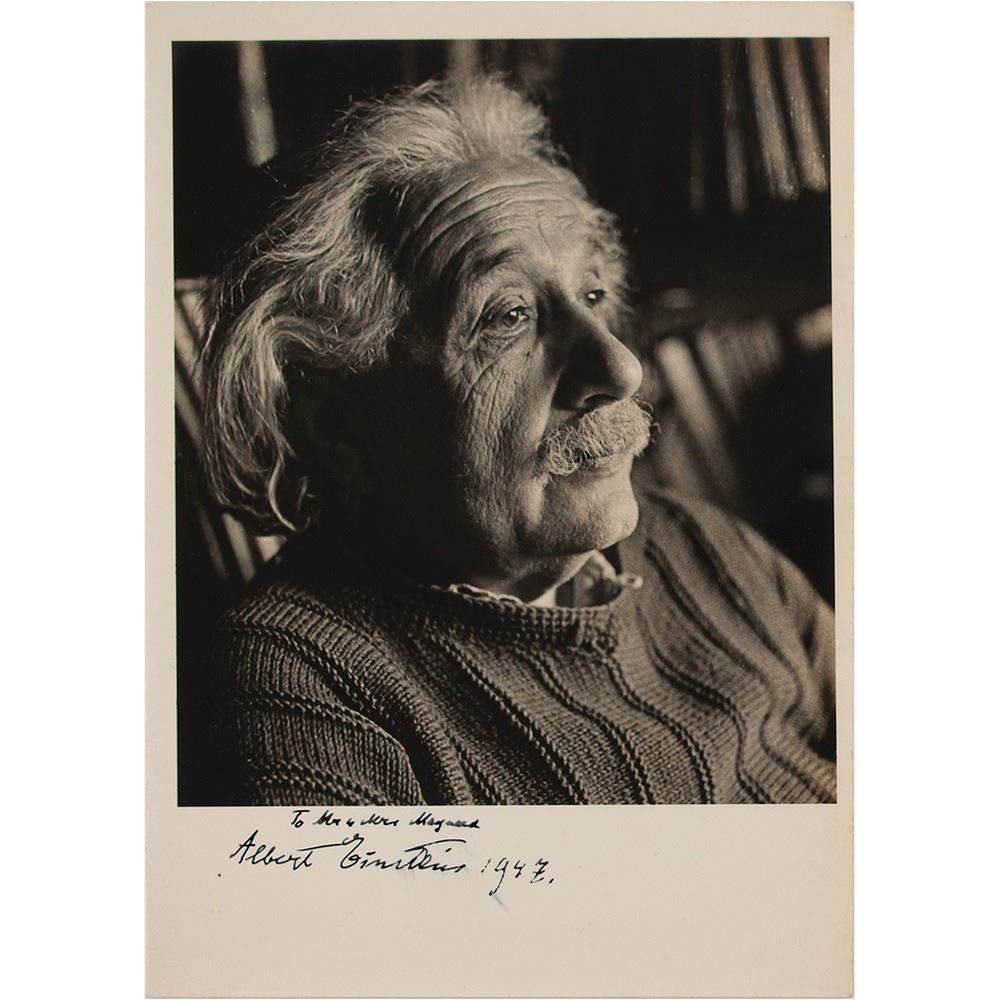 Highly appealing vintage matte-finish 5 x 7 portrait of Einstein relaxing in a sweater, signed and inscribed in fountain pen, "To Mr. & Mrs. Maynard, Albert Einstein 1947.†In very good to fine condition, with slight brushing to the ink, a light diagonal crease passing between Einstein's last name and the date, and light silvering to the perimeter of the image. Accompanied by a telegram from Einstein to "Mr. and Mrs. Lester Maynard," May 31, 1946, in full: "Hearty wishes for a happy life to the young couple and greetings for the families"; a telegram from "Aunt Helen," apparently Helen Dukas, Einstein's longtime secretary; five original candid photographs of Einstein, four of which include the original negatives; and a matte-finish portrait of Einstein by Philippe Halsman.