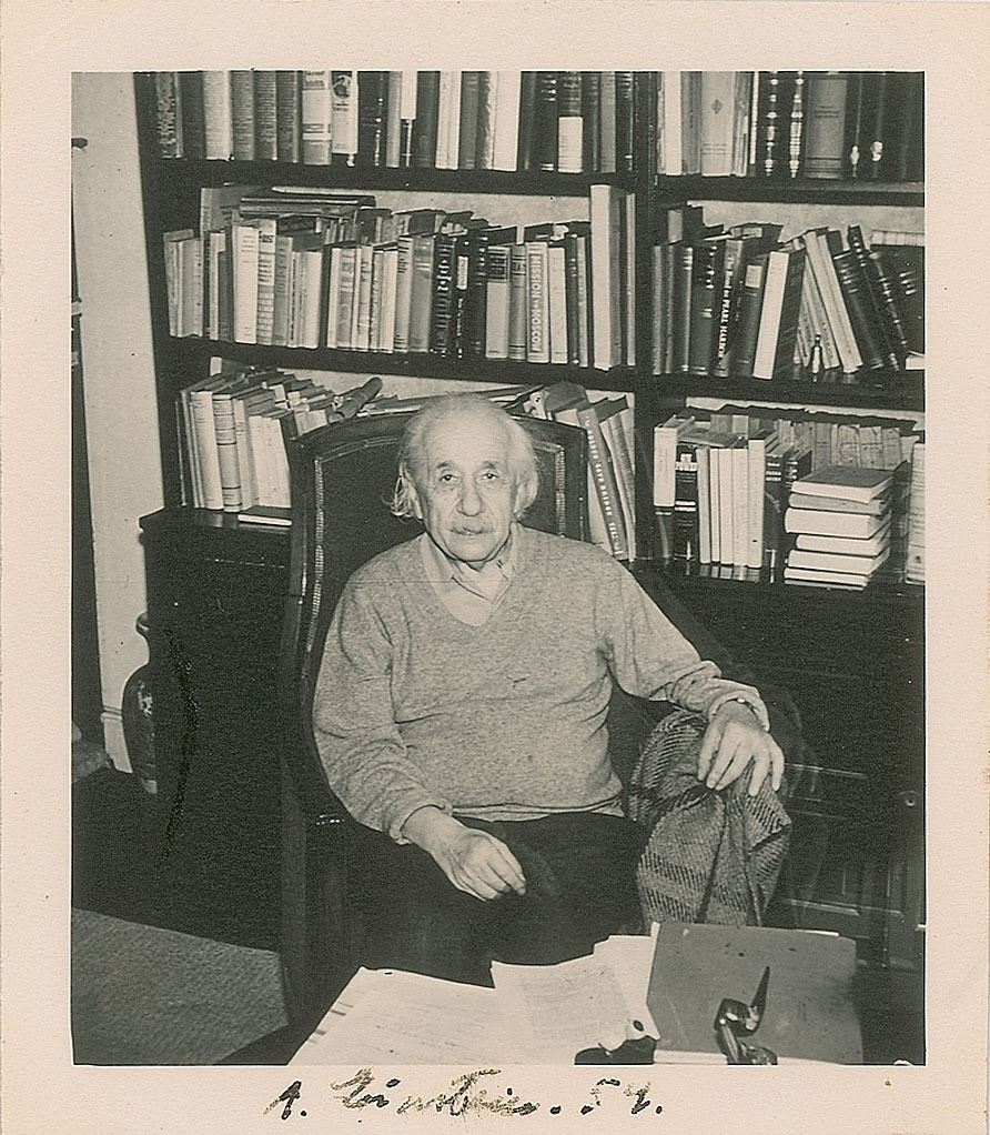 Wonderful vintage matte-finish 3.5 x 4 photo of Einstein at his desk with book-lined shelves in the background, signed in the lower border in fountain pen, "A. Einstein, 59." In fine condition, with old adhesive residue on the reverse. A superb, intellectual pose of one of the 20th century's greatest thinkers.