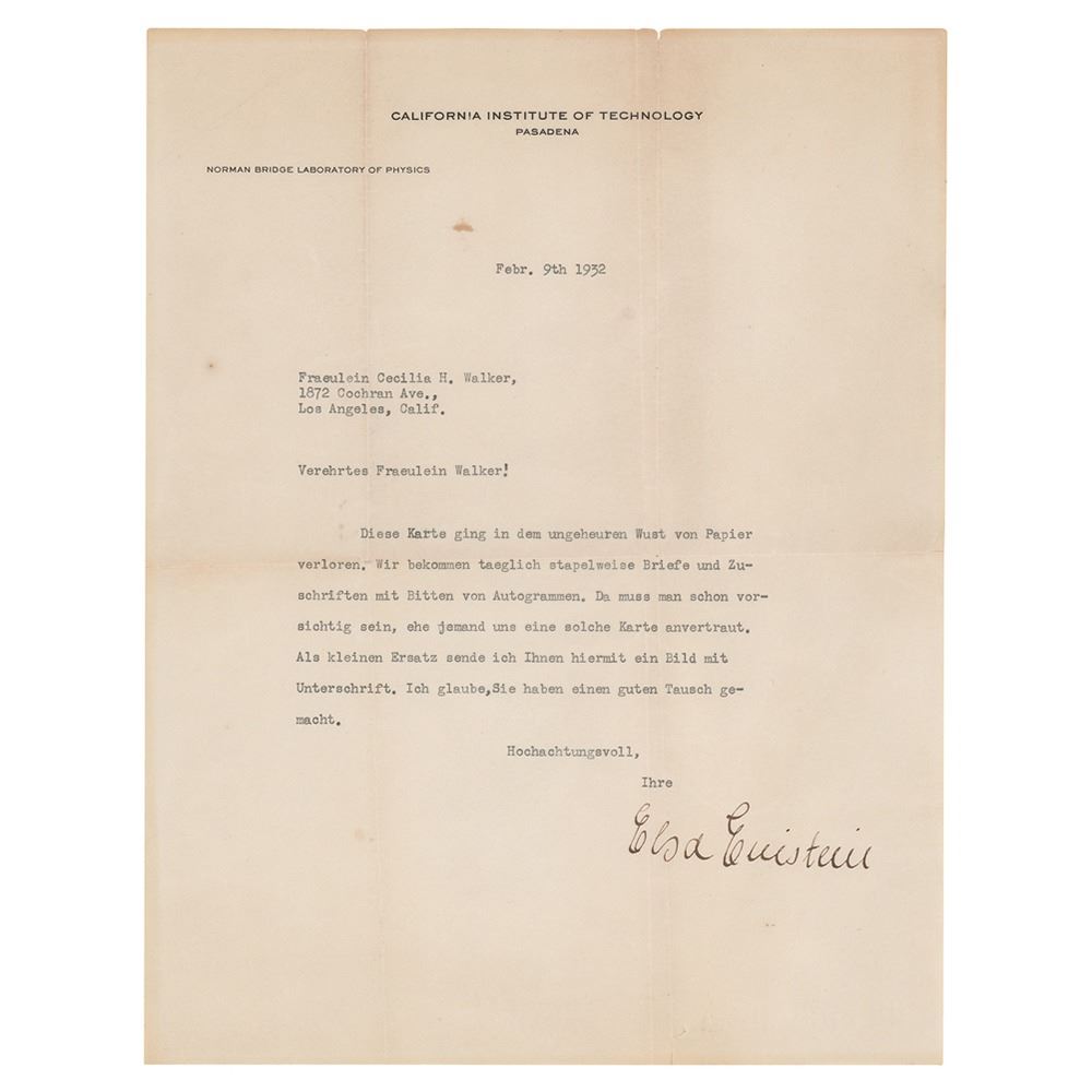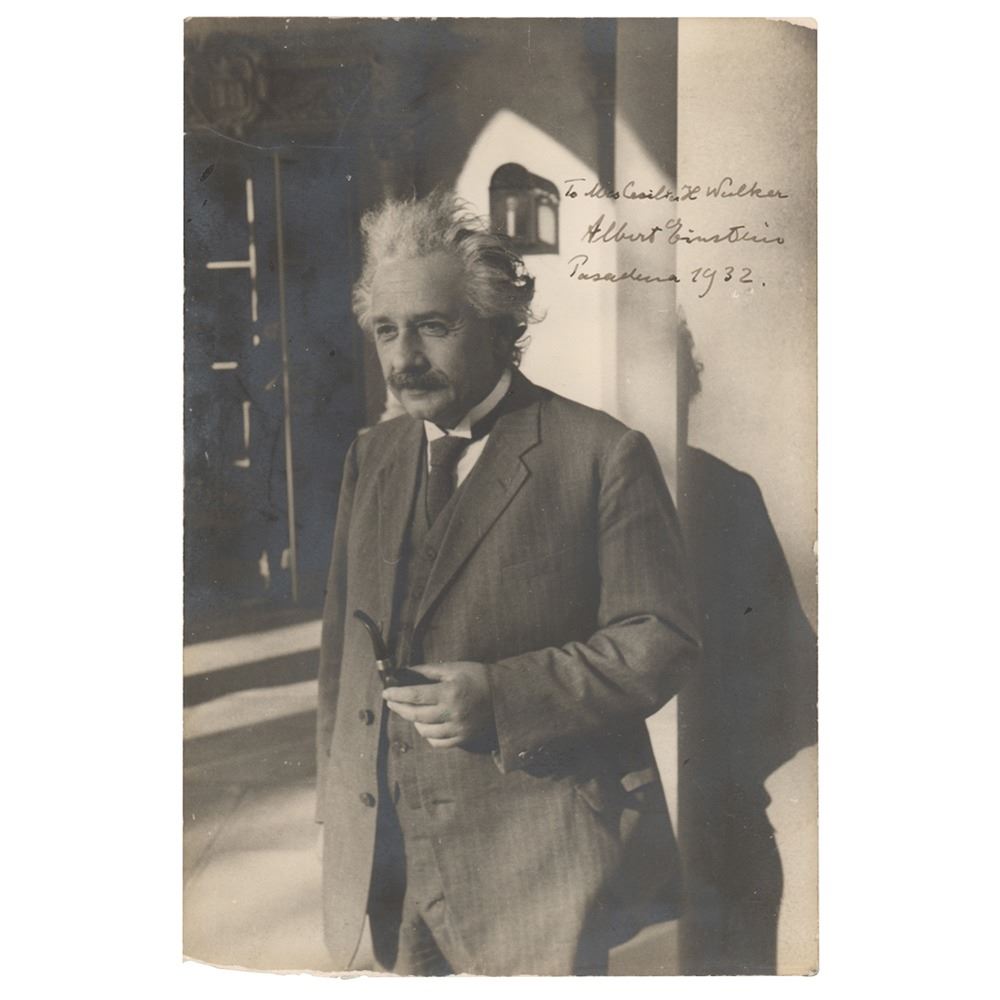 Outstanding vintage matte-finish 4.5 x 6.75 photo of Einstein with a pipe in hand at CalTech, neatly signed and inscribed in fountain pen, "To Miss Cecilia H. Walker, Albert Einstein, Pasadena 1932.” In very good to fine condition, with trimmed edges, and light silvering to the upper left background area. Accompanied by a transmittal letter in German signed by his wife, "Elsa Einstein," on California Institute of Technology letterhead, February 9, 1932, apologizing for a card lost amongst piles of paper, in part (translated): "Every day we receive stacks of letters and letters asking for autographs…As a small replacement, I hereby send you a picture with a signature, I think you have made a good exchange." A superb, most likely one-of-a-kind signed photograph of the genius.
