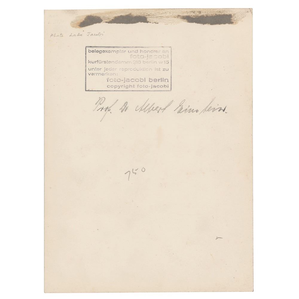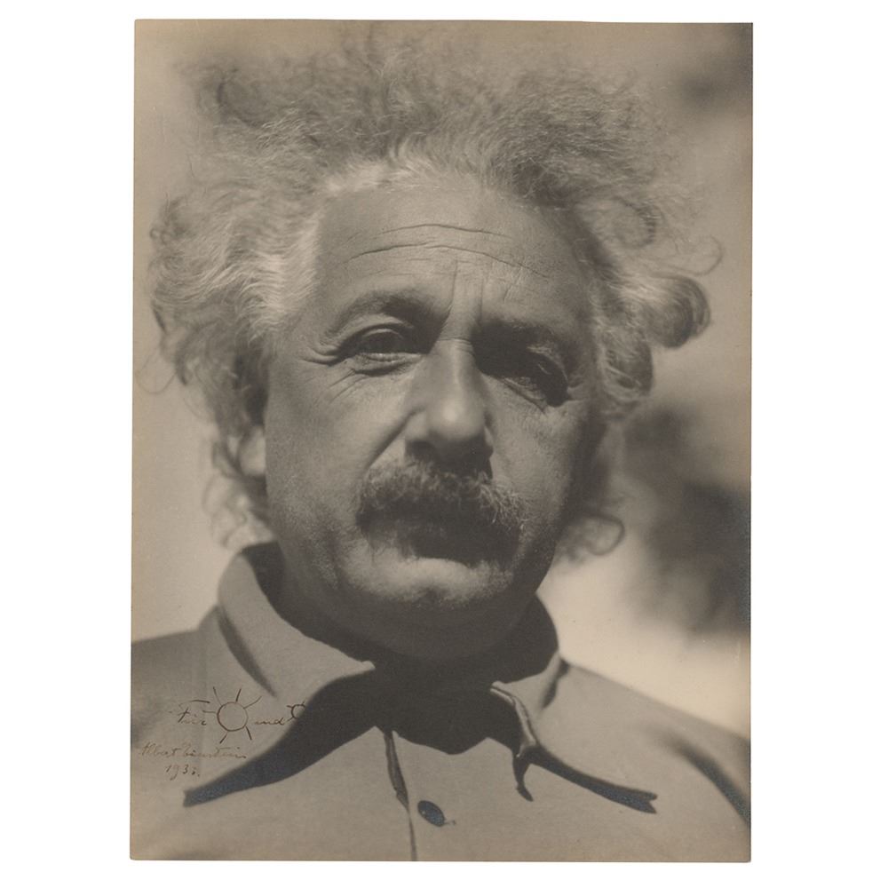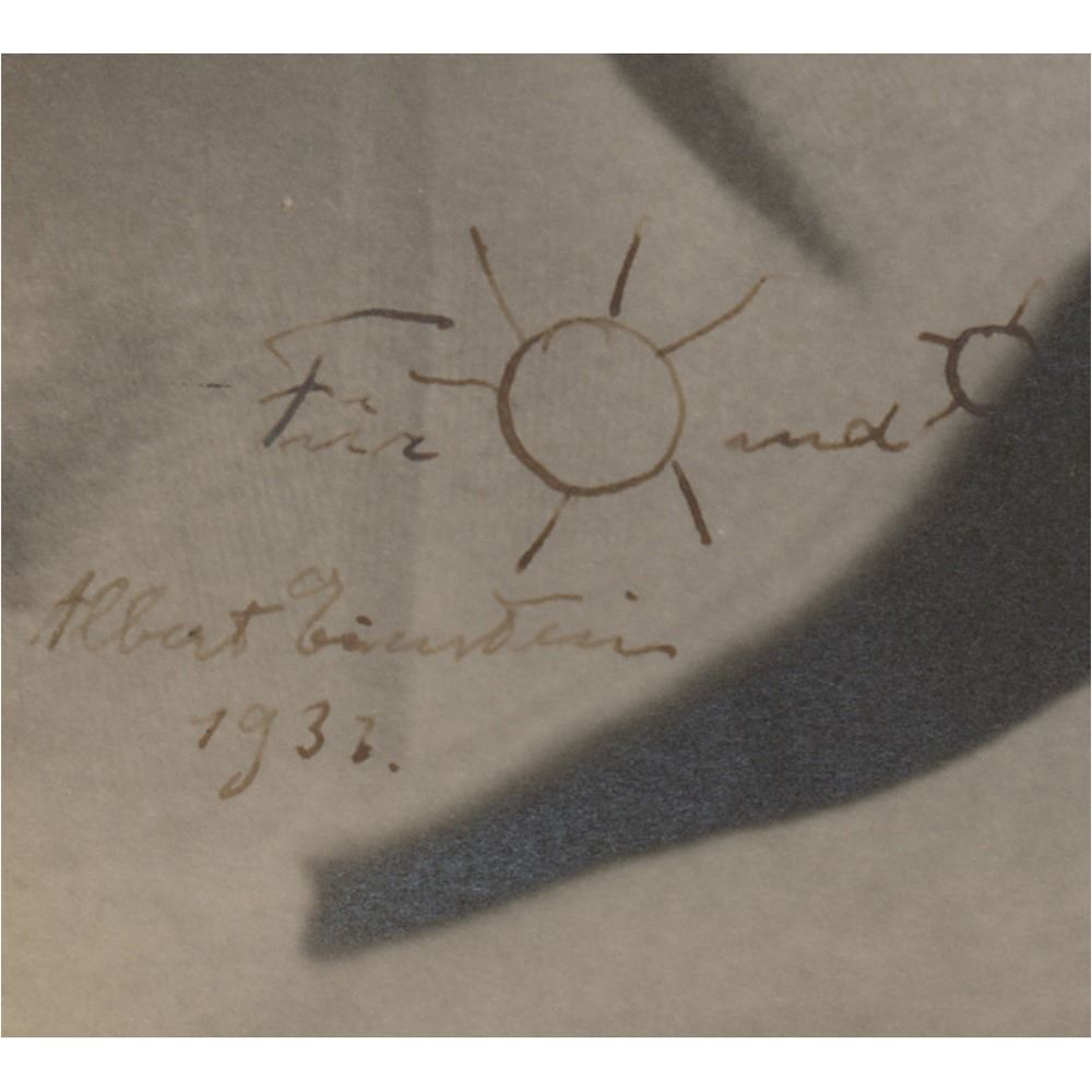 Exquisite vintage matte-finish 6.75 x 9 photo of Einstein by Lotte Jacobi, signed and inscribed in fountain pen "Fur [Sun] und [sun], Albert Einstein, 1932.‰Û Reverse bears a Foto-Jacobi Berlin copyright stamp. In fine condition, with a hint of subtle silvering, and some slight fading to the signature. This portrait was captured by influential German-American photographer Lotte Jacobi quite early in her esteemed career; she had joined the family's photo agency in Berlin in 1927. She is remembered for her portraits of leading figures of the arts and sciences, which often captured them at ease in informal settings. That Einstein signed it with his full name, and added rare sketches of two suns‰ÛÓperhaps a dedication to a friend and his wife‰ÛÓmakes it truly excellent. We have never seen another Einstein photo with a drawing on it‰ÛÓsuch autographs are virtually nonexistent.
