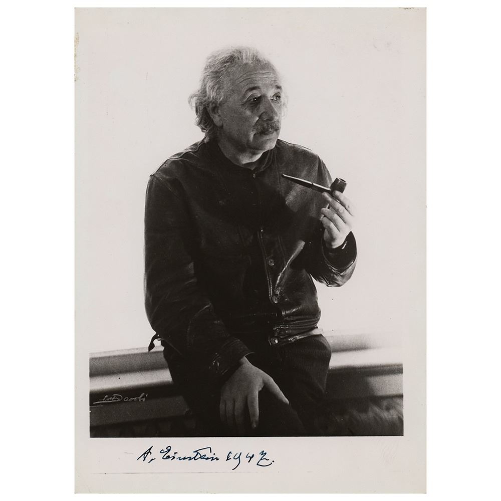 Vintage glossy 5 x 7 photo of Albert Einstein by Lotte Jacobi, showing him in a half-length pose wearing a leather jacket and holding a pipe, signed in the lower border in ink, "A. Einstein, 1942." In fine condition. Accompanied by a second unsigned photo of the same image.