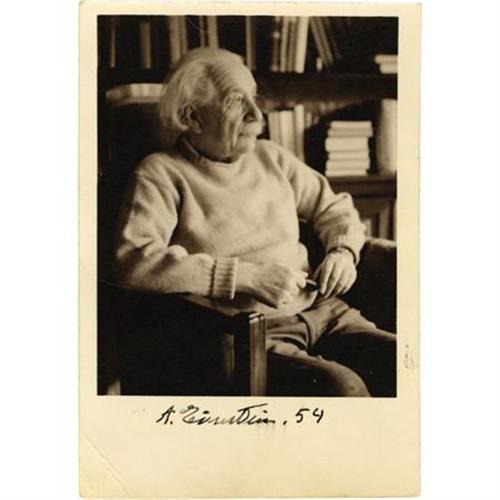 <B>Albert Einstein Photograph Signed</B></I> “<I>A. Einstein. 54,</B></I>” 3” x 3.75” sepia-tone image, overall 3.5” x 5”. Stamped on verso: “<I>Photo by/Alan W. Richards/Princeton, N.J.</B></I>” Folds at blank lower left corner. Lightly creased, not on Einstein's image. Fine condition.<BR><BR><b>Shipping:</b> Flat Material, Small (<a target="_blank" href="http://www.heritageauctions.com/common/shipping.php">view shipping information</a>)