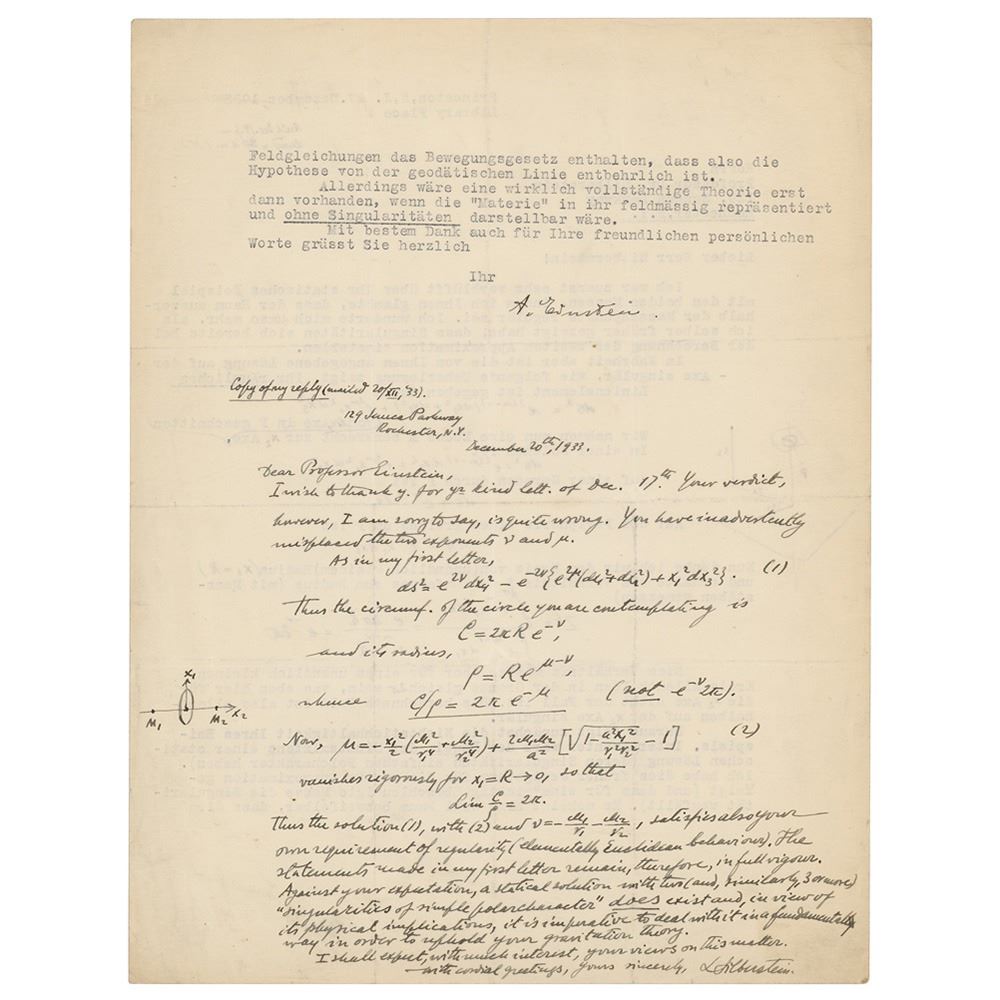 Below, Silberstein copies his response in his own hand, signed "L. Silberstein," demonstrating that Einstein’s proof is erroneous. It begins: "I wish to thank y. for yr kind lett. of Dec. 17th. Your verdict, however, I am sorry to say, is quite wrong. You have inadvertently misplaced the two exponents υ and μ." Silberstein shows this mathematically, concluding: "Against your expectation, a statical solution with two (and, similarly, 3 or more) 'singularities of simple polar character' does exist and, in view of its physical implications, it is imperative to deal with it in a fundamental way in order to uphold your gravitation theory." In fine condition, with minor creasing.