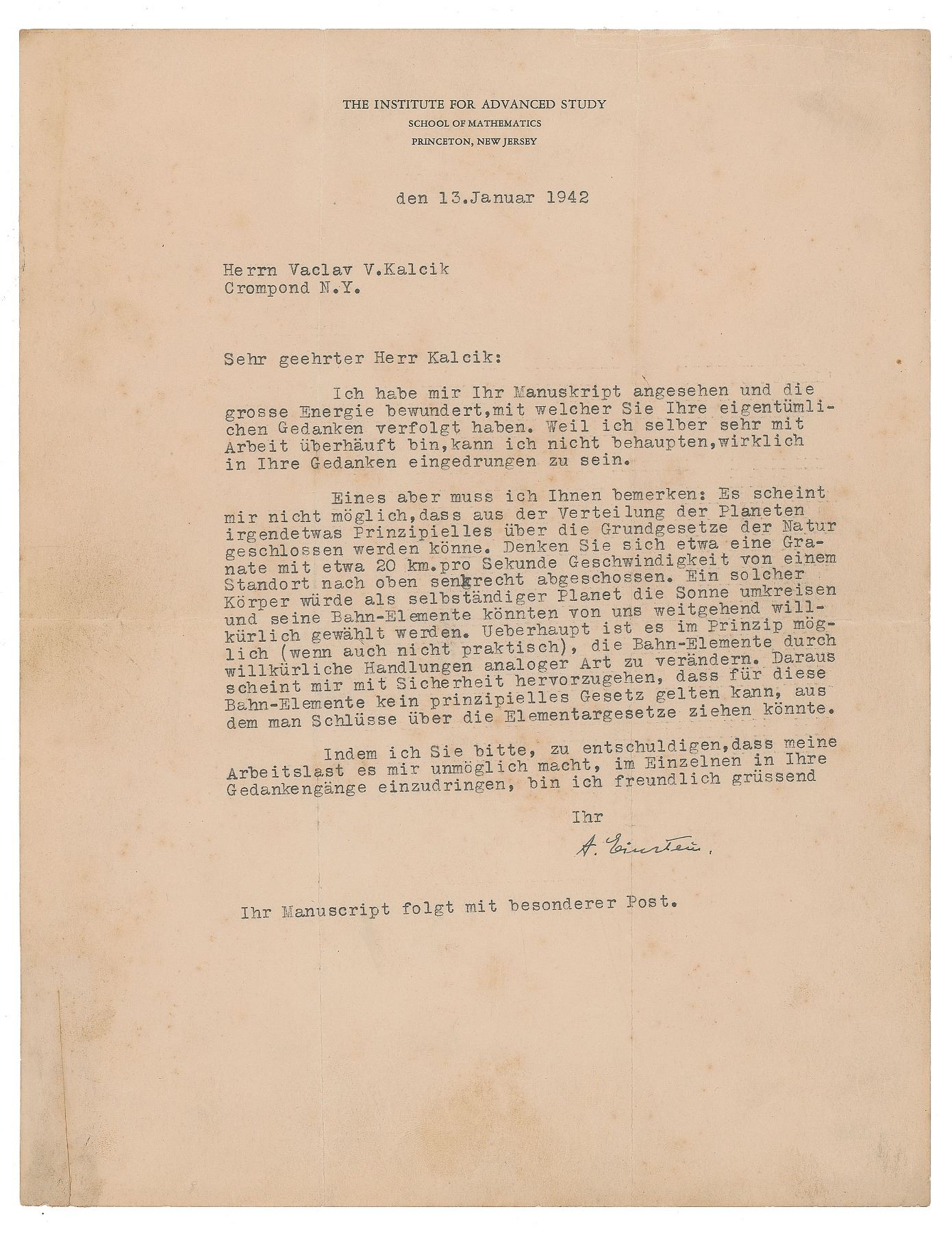 TLS in German, signed “A. Einstein,” one page, 8.5 x 11, The Institute for Advanced Study, Princeton letterhead, January 15, 1942. Letter to Vaclav V. Kalcik. Responding to the content of his correspondent’s manuscript—apparently arguing that the distance of the planets from the Sun suggest a priori design principle of Nature—Einstein here tersely dismisses the argument by analogizing a planet to a shell shot out of a cannon. Since such a projectile can be directed as one wishes, Einstein argues that it is possible to affect the orbit of the planets through similar “arbitrary actions”: therefore “there can be no principal law from which one could draw conclusions about the elementary laws [of planetary orbits].” The argument that the distribution of the planets in our solar system is the result of the working of a higher intelligence goes back at least as far as Plato and was perhaps most famously argued in the modern era by Kepler. Einstein’s argument here suggests that he saw the present order of the solar system more as a matter of chance rather than as a product of divine design. In very good to fine condition, with scattered light foxing and soiling, and a vertical slice to the lower left corner area repaired with old tape on the reverse.
