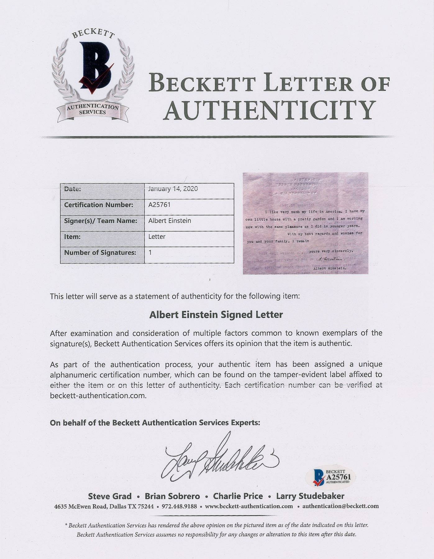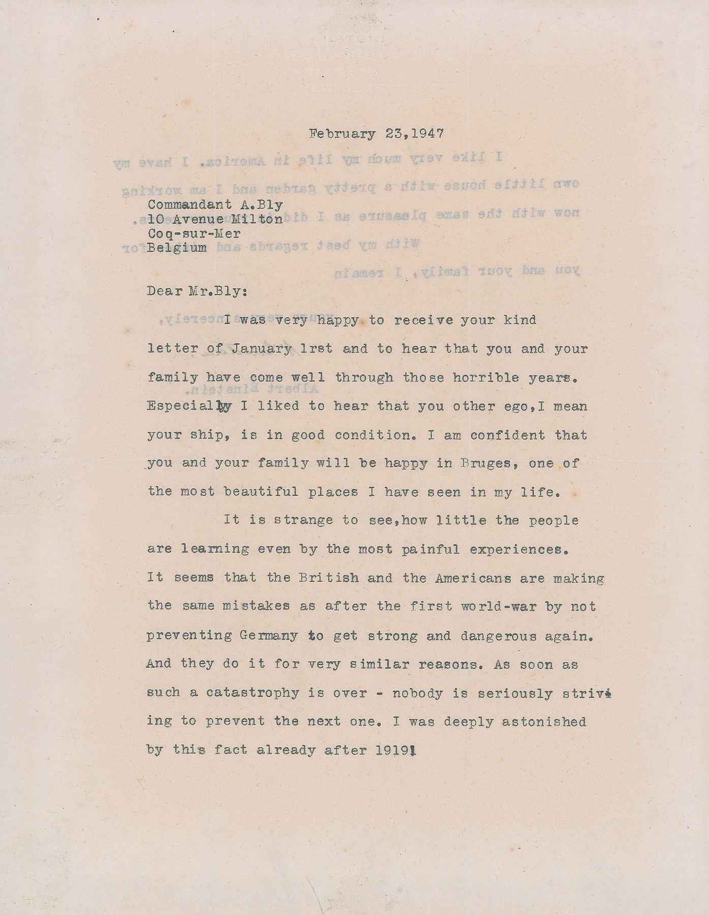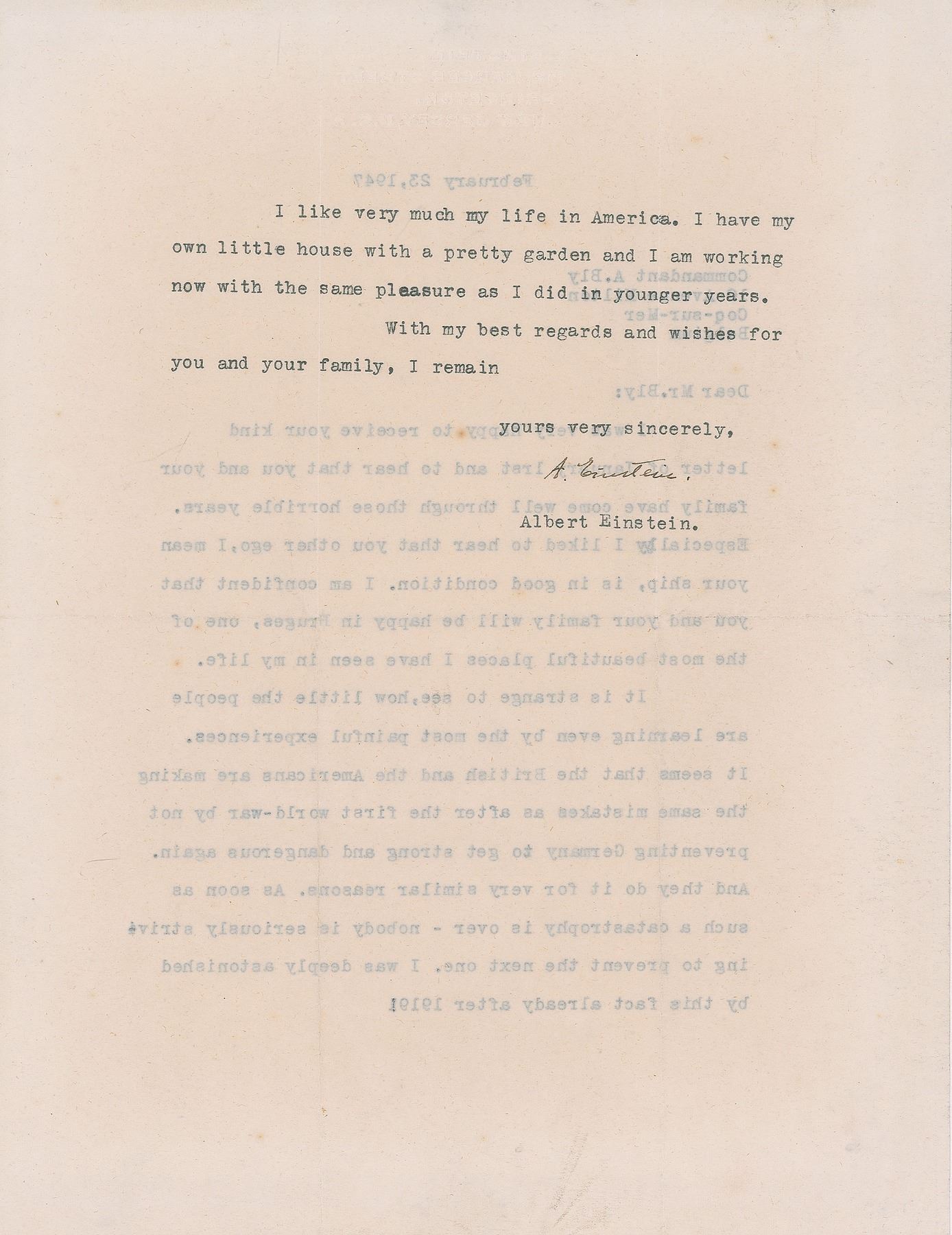 TLS signed “A. Einstein,” one page both sides, 8.5 x 11, blindstamped Princeton letterhead, February 23, 1947. Letter to Commandant A. Bly in Belgium, in full: "I was very happy to receive your kind letter of January 1rst and to hear that you and your family have come well through those horrible years. Especially I liked to hear that you other ego, I man your ship, is in good condition. I am confident that you and your family will be happy in Bruges, one of the most beautiful places I have seen in my life. It is strange to see, how little the people are learning even by the most painful experiences. It seems that the British and the Americans are making the same mistakes as after the first world-war by not preventing Germany to get strong and dangerous again. And they do it for very similar reasons. As soon as such a catastrophe is over—nobody is seriously striving to prevent the next one. I was deeply astonished by this fact already after 1919! I like very much life in America. I have my own little house with a pretty garden and I am working now with the same pleasure as I did in younger years." In fine condition. Accompanied by a full letter of authenticity from Beckett Authentication Services.