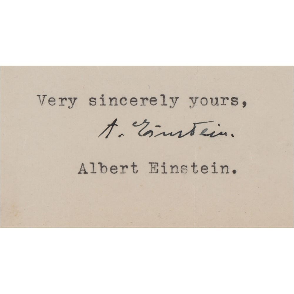 TLS signed “A. Einstein,†one page, 8 x 10.25, blindstamped personal Princeton letterhead, February 23, 1945. Letter to Dr. I. Franklin Miller at the University of Pittsburgh Medical Arts Building, in full: "I am glad to inform you that I received—through the kindness of Dr. Spayde—the interesting book by Dr. Price. I am convinced that there is considerable truth in the matter. I observed myself that the people in Czecho-Slovackia were much better developed than the people in Switzerland. And I was convinced that this was due to the more primitive living-conditions. I wonder whether the relevant factors are already recognized. I believe that a good deal of our deterioration may be due to the fact that natural selection is to a great extent prevented by the progress of medicine." In very good to fine condition, with light creasing and toning, and a paperclip impression to the top edge. A unique letter connecting Einstein and Darwin, with the great physicist weighing in on Darwin's evolutionary theory—positing that natural selection has been slowed down by the advent of modern medicine.
