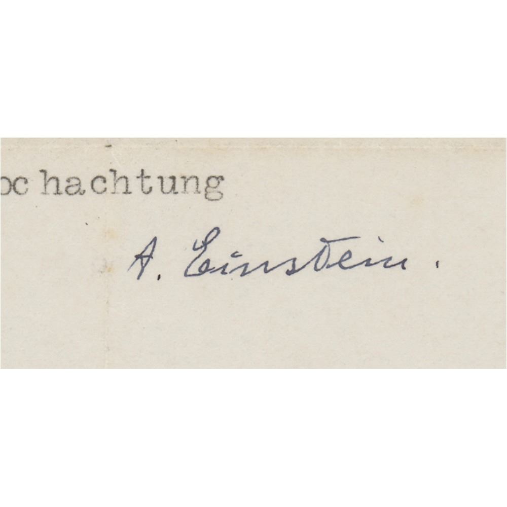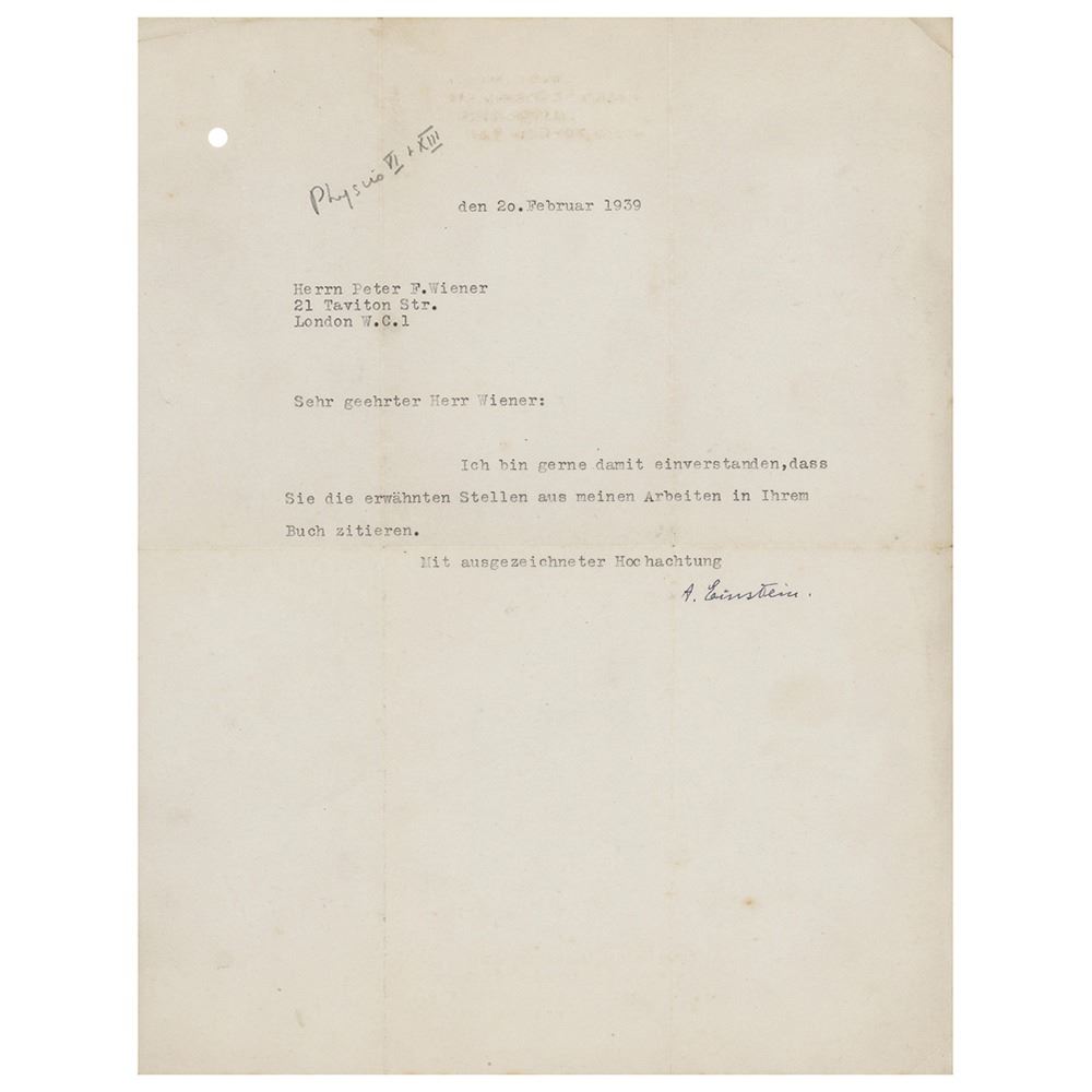 TLS signed “A. Einstein,†one page, 8.5 x 11, personal Princeton, New Jersey letterhead, February 20, 1939. Letter to author and schoolteacher Peter F. Wiener, granting him permission to cite a quotation in a publication, German with Tears. In full (translated): "I would like to agree that you quote the passages mentioned from my work in your book. With great respect." In fine condition, with one small file hole to the upper left corner. Accompanied by a letter of provenance stating that the consignor's father was presented with this letter by Wiener in the late 1940s.