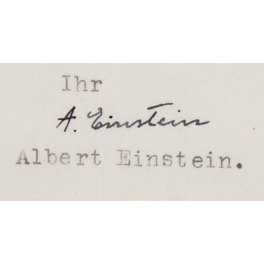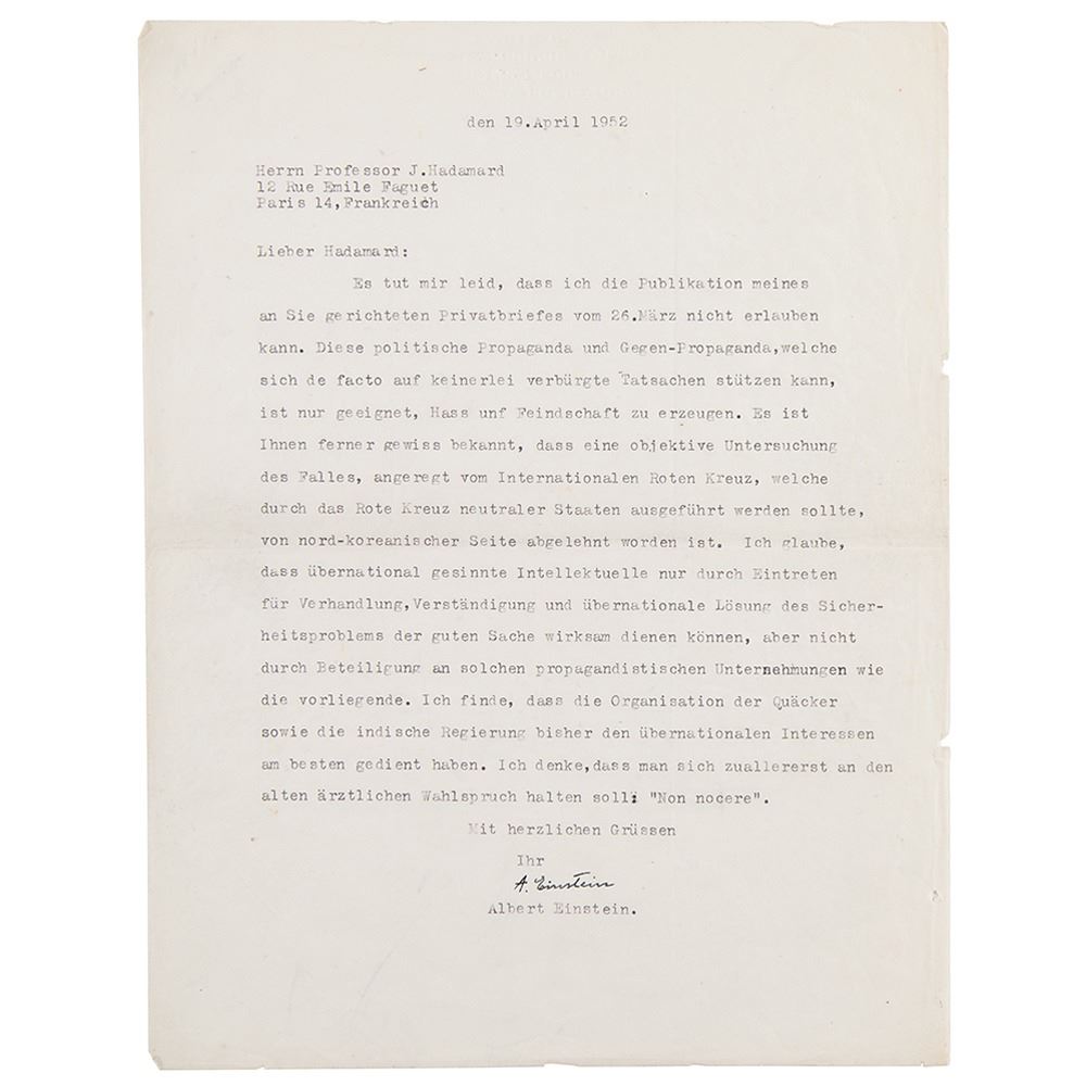 TLS in German, signed “A. Einstein,” one page, 8.5 x 11, blindstamped Princeton letterhead, April 19, 1952. Letter to French mathematician Jacques Hadamard, related to his efforts as a pacifist activist. In part (translated): "I am sorry that I cannot authorize the publication of my private letter addressed to you…This political propaganda and counter-propaganda, which in fact cannot be based on any verified facts, is only suitable to create hatred and hostility. You are also aware that an objective investigation of the case, suggested by the International Red Cross, which was to be carried out by the Red Cross of neutral countries, has been rejected by the North Korean side. I believe that transnationally minded intellectuals can only serve the good cause effectively by advocating negotiation, understanding and transnational solution of the security problem, but not by engaging in such propaganda ventures as the present one. I find that the Quacker organization [sic!] and the Indian government have served the supranational interests best so far. I think that one should first and foremost stick to the old medical motto: 'Non nocere.'" In fine condition, with some chipping along the edges.