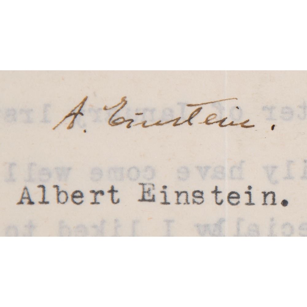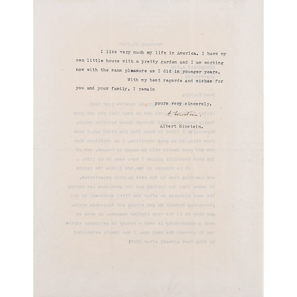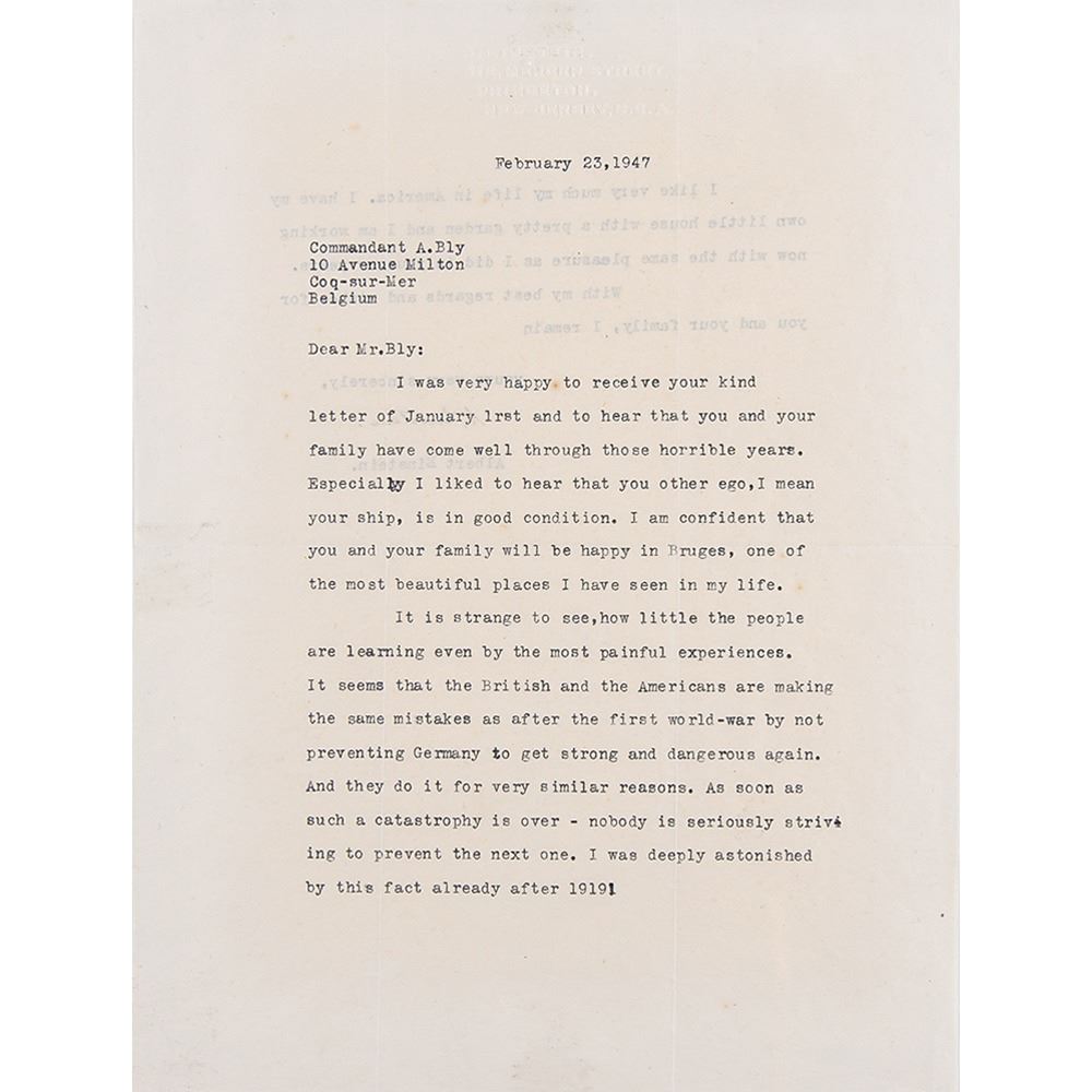 TLS signed “A. Einstein,” one page both sides, 8.5 x 11, blindstamped Princeton letterhead, February 23, 1947. Letter to Commandant A. Bly in Belgium, in full: "I was very happy to receive your kind letter of January 1rst and to hear that you and your family have come well through those horrible years. Especially I liked to hear that your other ego, I mean your ship, is in good condition. I am confident that you and your family will be happy in Bruges, one of the most beautiful places I have seen in my life. It is strange to see, how little the people are learning even by the most painful experiences. It seems that the British and the Americans are making the same mistakes as after the first world-war by not preventing Germany to get strong and dangerous again. And they do it for very similar reasons. As soon as such a catastrophe is over—nobody is seriously striving to prevent the next one. I was deeply astonished by this fact already after 1919! I like very much life in America. I have my own little house with a pretty garden and I am working now with the same pleasure as I did in younger years." In fine condition. Accompanied by a matte-finish portrait of the genius.