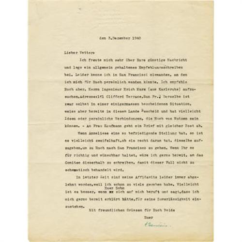 <B>Albert Einstein Typed Letter Signed</B></I> “<I>A. Einstein</B></I>,” one page, 8.5” x 11”. Princeton, New Jersey, December 3, 1940. To an unidentified cousin. In German with full English translation. In part, “<I>I am very happy about the good news and enclose a general recommendation letter. Unfortunately I don't know anybody in San Francisco whom I could contact in your matter. I advise you however to visit engineer Erich Marx (from Karlsruhe)…He is also in a rather modest situation, but he knows this country and perhaps he has some ideas or personal connections which could be helpful to you…If Anneliese has such a good job at the moment, perhaps she should not give it up to join you in San Francisco. If you want me to I will gladly write to the Committee so that this case is not treated in the normal routine way. Unfortunately my affidavits have always been turned down lately because I have already submitted too many. Perhaps it would be better if your son quotes me as a reference and informs the people in question that I guarantee his reliability…</B></I>” Einstein's cousin wished to come to the United States and work in San Francisco. The International Rescue Committee had been formed in 1933 at Einstein's request to aid refugees fleeing Germany. Einstein's cousin eventually came to the United States from Germany via Russia, China, and Japan. Anneliese is his cousin's daughter. Folds. Personal, family letters of Einstein rarely come on the market. Fine condition.<BR><BR><b>Shipping:</b> Flat Material, Small (<a target="_blank" href="http://www.heritageauctions.com/common/shipping.php">view shipping information</a>)