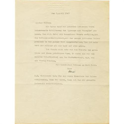 <B>Albert Einstein Typed Letter Signed</B></I> “<I>Albert,</B></I>” one page, 8.25' x 10.75”. Princeton, New Jersey, April 2, 1943. To an unidentified cousin. In German with full English translation. In full, “<I>We have read your interesting description of 'Exodus from Mizrahim' here with greatest interest. What really makes me happy is the matter of fact way in which our Jewish people in the whole world hold together. That is worth more and stronger than a country and an army. I was very happy about the visit of Anneliese and her wonderful husband. He looks like a robust leftover from the Maccabee's time, i.e. like a solid rock.</B></I>” In a postscript, Einstein adds, “<I>Perhaps you have only a few copies of this travel description. If you want me to, I can send my copy back.</B></I>” “Exodus from Mizrahim” was a newspaper series in the <I>San Francisco Chronicle</B></I> by Einstein's cousin relating his experiences in leaving Germany and coming to the United States via Russia, China, and Japan. Anneliese is his cousin's daughter. Einstein family letters signed “Albert” are virtually unobtainable. Fine condition.<BR><BR><b>Shipping:</b> Flat Material, Small (<a target="_blank" href="http://www.heritageauctions.com/common/shipping.php">view shipping information</a>)