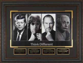 Think different was an advertising slogan for Apple, Inc. in 1997.The words "think different" were created by Chiat\Day art director Craig Tanimoto. This "Think Different" features the Laser Engraved Replica Signatures of John F. Kennedy, John Lennon, Steve Jobs, and Albert Einstein. Quality Leather Framed as shown with descriptive plaques and quotes from each. to Approx overall size of 25x34.