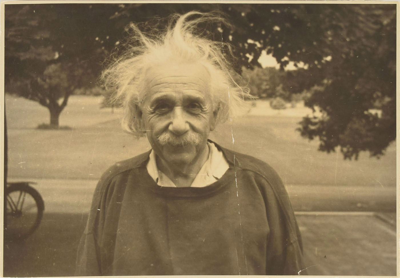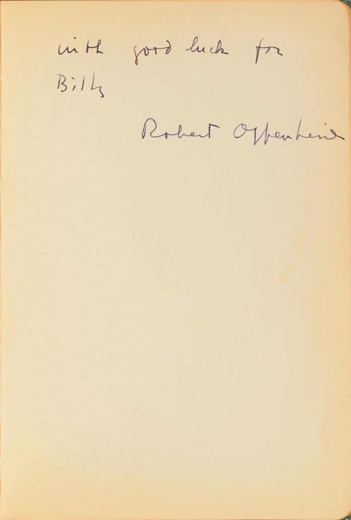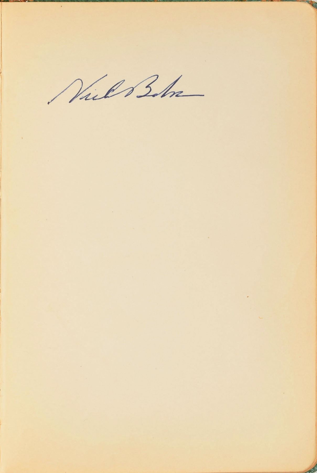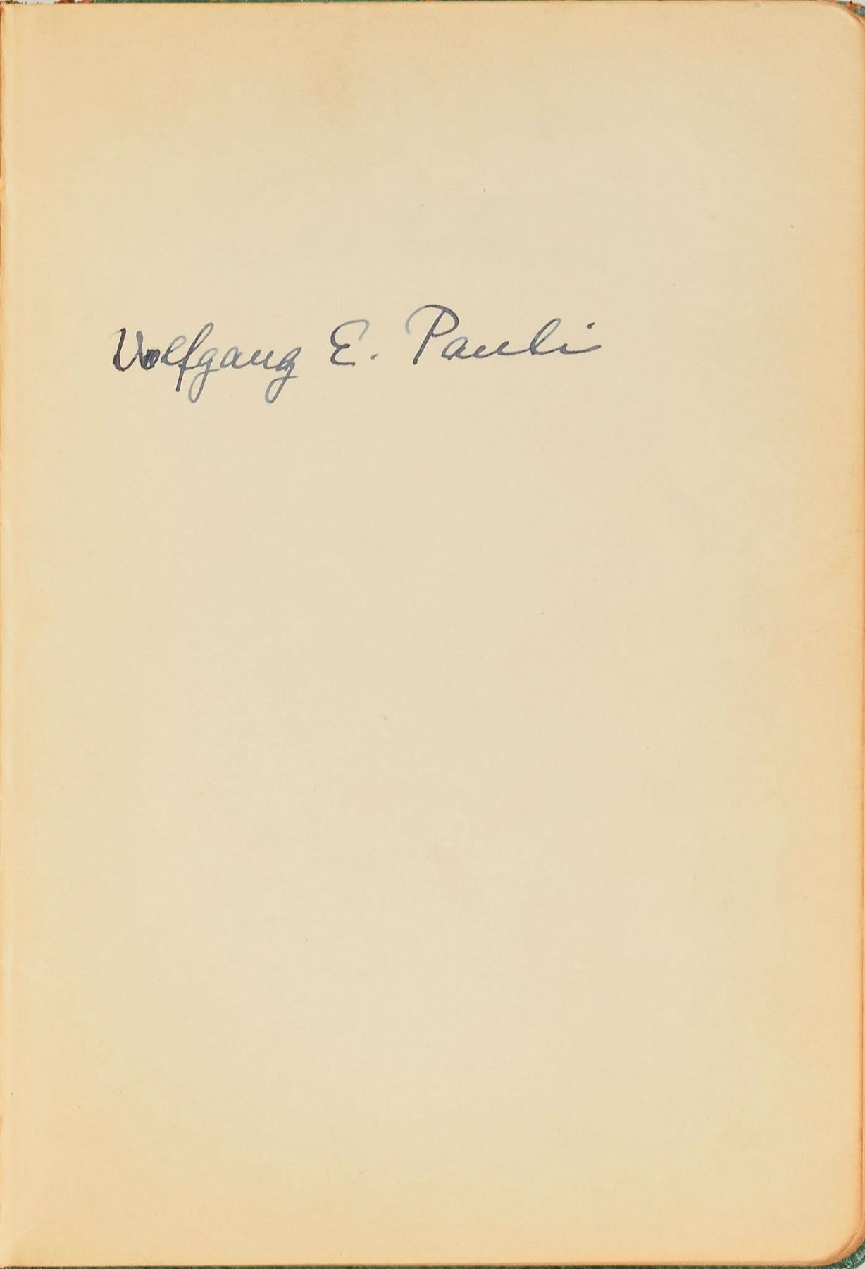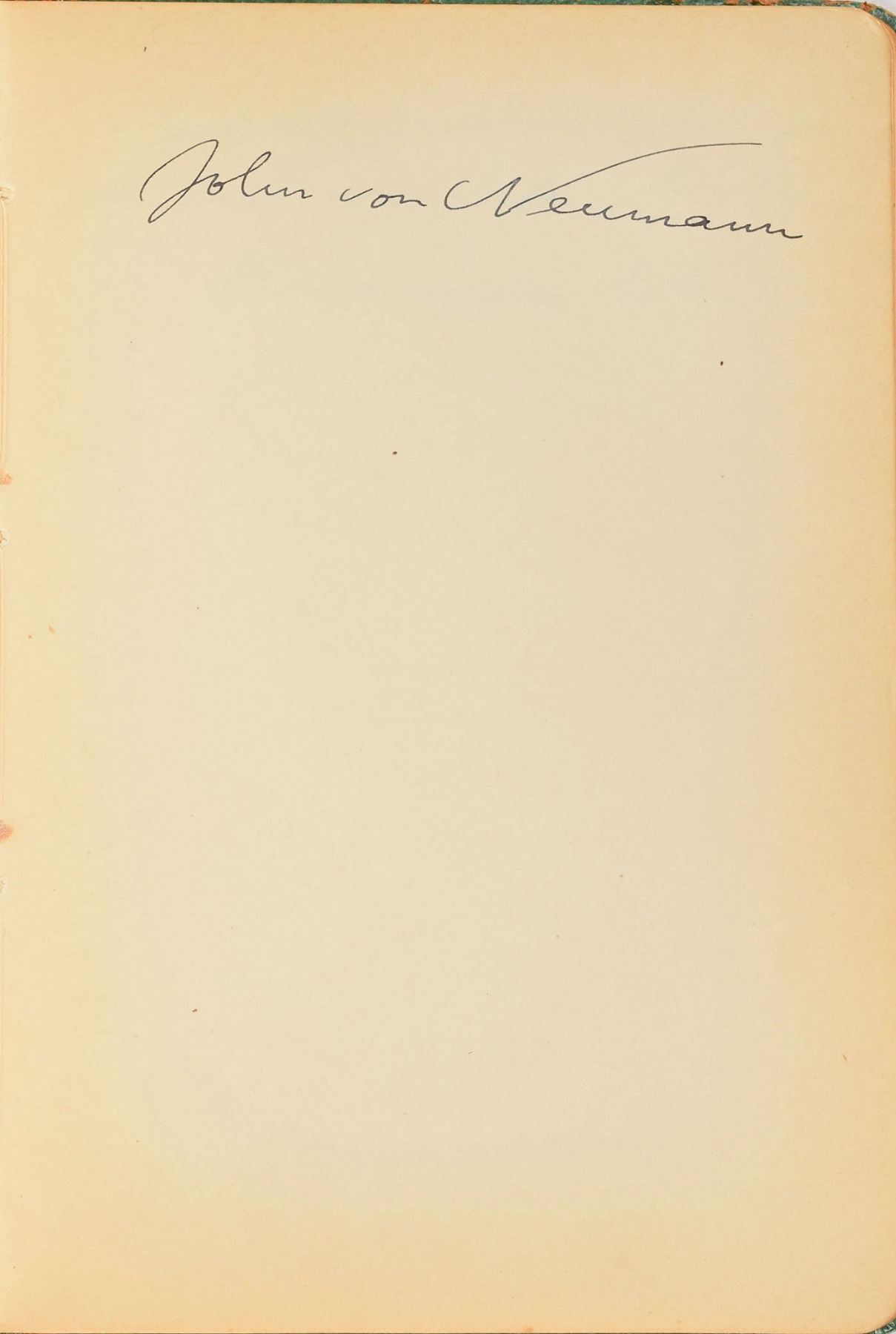 Amazing circa 1950 hardcover autograph album, 5 x 7, signed inside by numerous luminaries from Princeton's Institute for Advanced Study, including: Albert Einstein, John von Neumann, J. Robert Oppenheimer, Niels Bohr, Wolfgang Pauli, Abraham Pais, George Kennan, Oswald Veblen, James Waddell Alexander II, Hermann Weyl, Harold F. Cherniss, Ivan M. Linforth, Kurt Reidemeister, Walter W. Stewart, E. A. Lowe, Erwin Panofsky, Herbert Feis, Atle Selberg, Arnold J. Toynbee, and others. A vintage candid 6.5 x 4.5 portrait of Einstein is laid into the book. In fine condition, with wear to the album's covers and vertical creases to the photograph. Consignor notes that the album belonged to physicist William R. Bennett, Jr., who received his bachelor's degree at Princeton; the front cover is gilt-stamped "W. B. Jr." In 1960, Bennett co-invented the first gas laser at Bell Labs. A remarkable autograph album signed by several of the greatest intellectuals of the 20th century—a veritable who's who of legendary physicists and mathematicians.