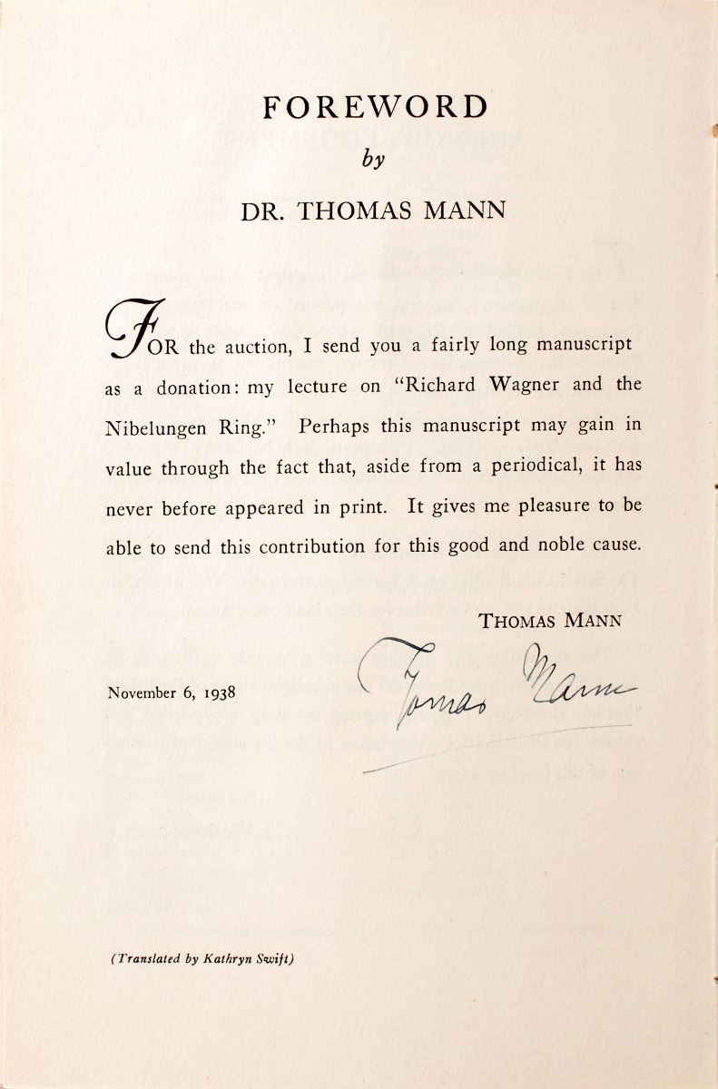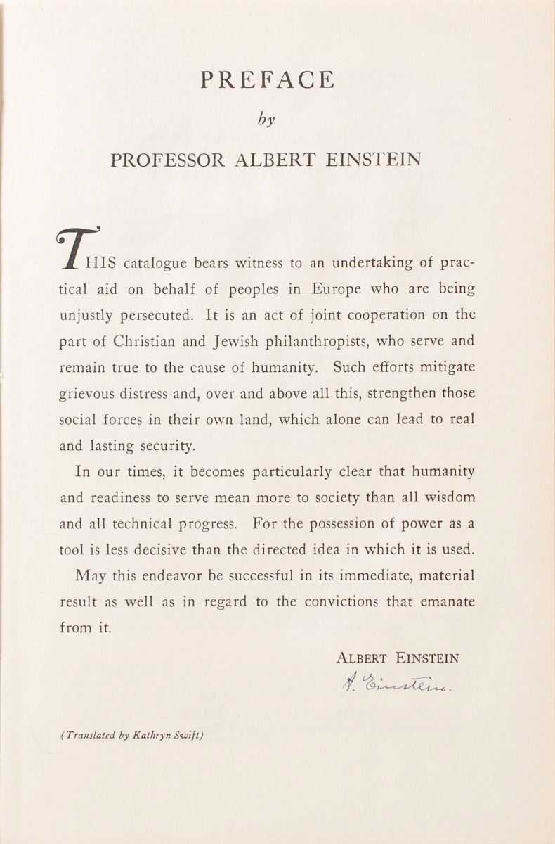 The auction was organized by noted bookseller A. S. W. Rosenbach as a fundraiser for refugees fleeing persecution in Europe just prior to the outbreak of World War II. Manuscripts were donated by the likes of Irving Berlin, Robert Frost, and Louis Brandeis, in addition to Einstein and Mann. Einstein’s moving preface reads, in part: “This catalogue bears witness to an undertaking of practical aid on behalf of peoples in Europe who are being unjustly persecuted...In our times, it becomes particularly clear that humanity and readiness to serve mean more to society than all wisdom and all technical progress. For the possession of power as a tool is less decisive than the directed idea in which it was used.” Signed by the two most prominent German exiles living in America during these prewar years, this is a rare and extraordinary piece.
