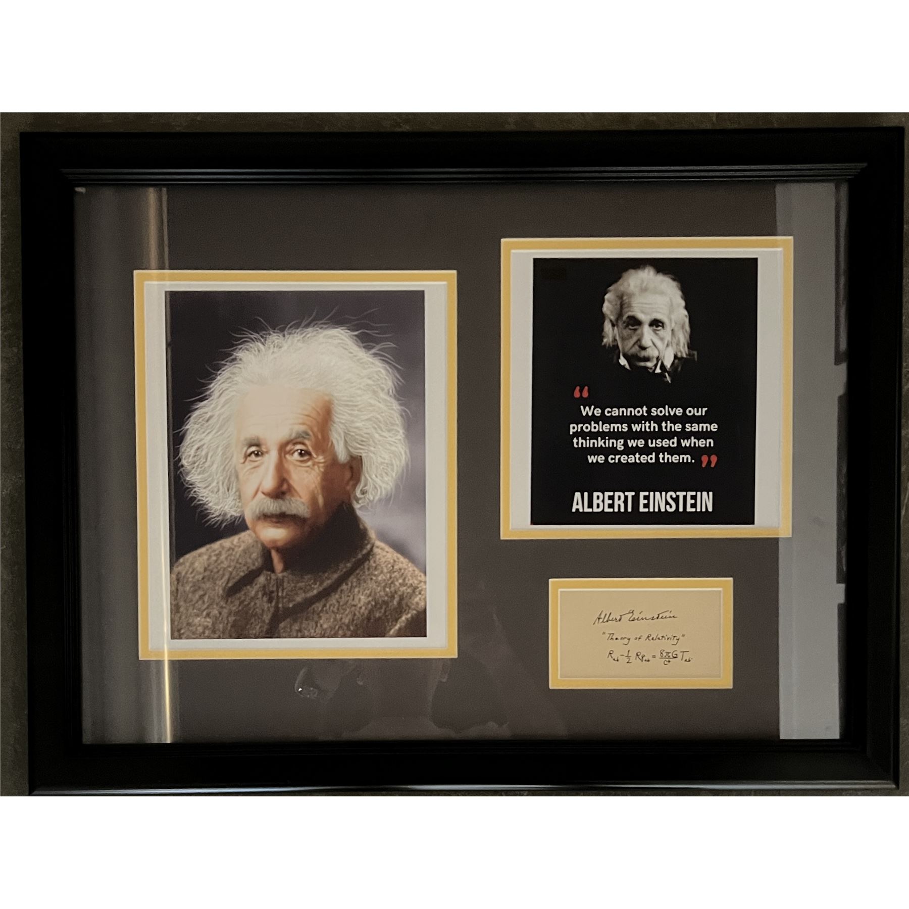 Albert Einstein signed Theory of Relativity quote and equation collage. GFA authenticated. 18x22 inches