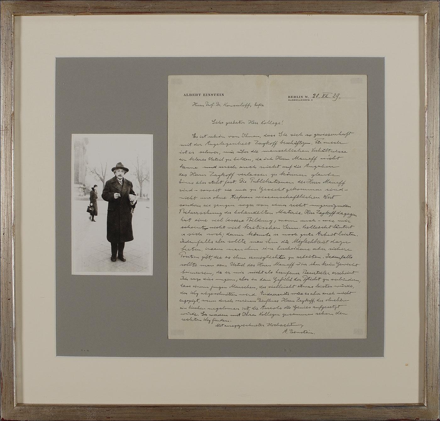 An unusually large and beautiful ALS written in Einstein's 50th year. Rare ALS signed “A. Einstein,” one page, 9 x 11.25, personal letterhead, July 20, 1929. Letter advising two candidates for academic hire. In full (translated): “How admirable of you, to concern yourself in such a conscientious manner with the Zaykoff matter. It’s difficult for me assessing the situation from a strictly human perspective, as I don’t know Mr. Maneff personally and also don’t feel particularly comfortable taking Mr. Zaykoff’s claims at face value. One thing, however, is for certain. Mr. Maneff’s publications – at least the ones I am aware of – are not only devoid of any deeper scientific merit, but are also revealing his quite insufficient grasp of the very subject he is addressing. Mr, Zaykoff, by contrast, is much better educated, even if – as it seems to me – he lacks a certain critical understanding. Perhaps over time he will gain more refinement and may yet surprise with future accomplishments. At any rate, he should be given a chance by being offered a modest, but secure position where he can put his abilities to work. Above all, Mr. Maneff’s judgment about Zaykoff should not be taken too seriously, as in my view, he does not appear to be a very reliable judge of the situation. While I hesitate making that statement, I do so because I feel obligated to save a young man from being denied opportunities that perhaps could result in worthwhile achievements. On the other hand, it would be uncalled for if, through any influence of mine, Mr. Zaykoff, who already has a touch of megalomania, should be prompted to consider himself a genius. However, I am confident you will, together with your colleagues, take the right course of action.” The letter appears to be affixed to a mat at each of its four corners, and is in turn matted and framed with a portrait of Einstein posing outdoors, to an overall size of 19.75 x 18. Intersecting folds, small blocks of toning to each corner from mounting on reverse, and some scattered light toning, otherwise fine condition. Accompanied by the original mailing envelope, addressed in Einstein’s hand.