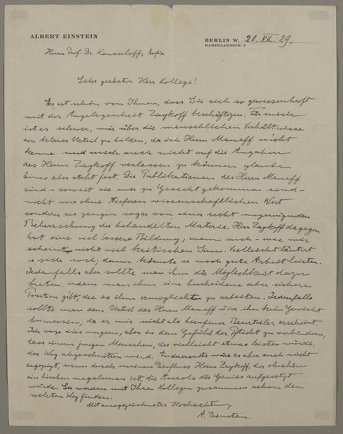 Einstein’s assessment of Georgi Ivanoff Maneff, the founder and the first person to chair the Department of Theoretical Physics at Sofia University in Bulgaria, is brutal. “Mr. Maneff’s publications...are not only devoid of any deeper scientific merit, but are also revealing his quite insufficient grasp of the very subject he is addressing,” Einstein bluntly states. His view of Rashko Zaykoff, a physicist theorist, was a bit less biting. “Mr. Zaykoff, who already has a touch of megalomania, should be prompted to consider himself a genius,” Einstein advises, before turning the matter over to the recipient and his colleagues in confidence that they will “take the right course of action.” Maneff and Zaykoff once had a dynamic relationship that grew into a tense conflict, as evidenced here, and one in which Einstein became purposely and deliberately involved in, serving as a ‘scientific judge’ and arbiter to settle the complicated situations and tensions.