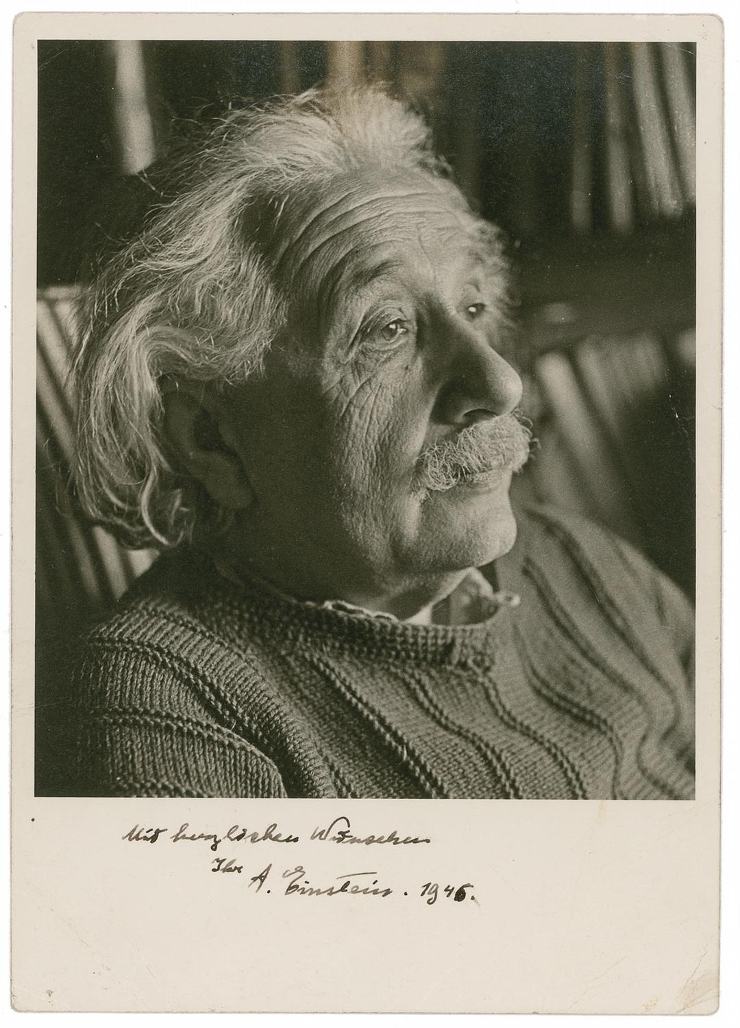 Superb signed copy of Hermann Landshoff's visually stunning image of Einstein.Vintage 5 x 7 close-up photo of Einstein in his library, originally taken by the famous New York photographer Herman Landshoff circa 1945, inscribed in the lower border in black ink in German and signed “A. Einstein 1946.” In very good condition, with scattered creases, a couple lightly affecting a few letters of inscription, bends to corners,silvering to top area of image above Einstein’s head, a bit of light border soiling, and a trivial brush to date.