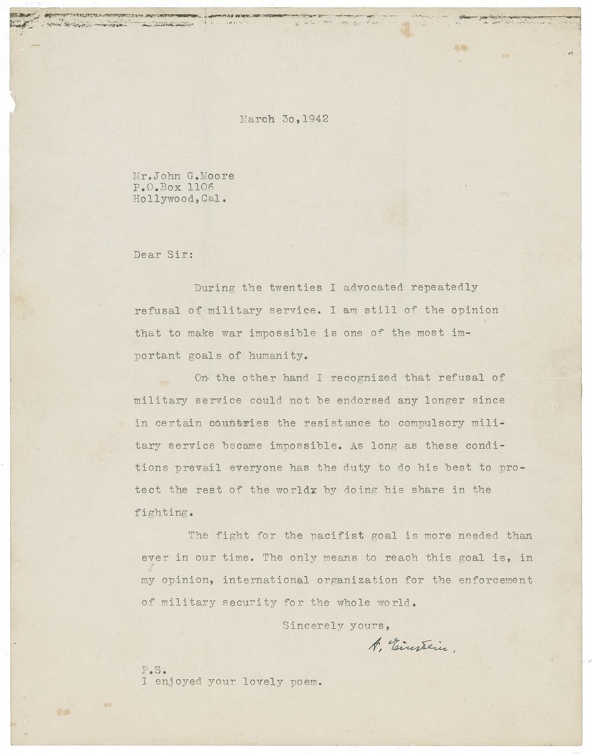 Superb and historically important TLS signed “A. Einstein,” one page, 8.5 x 11, blind-stamped personal letterhead, Princeton, March 30, 1942. Letter to John Moore in Hollywood, California. In full: “During the twenties I advocated repeatedly refusal of military service. I am still of the opinion that to make war impossible is one of the most important goals of humanity. On the other hand I recognized that refusal of military service could not be endorsed any longer since in certain countries the resistance of the compulsory military service became impossible. As long as these conditions prevail everyone has the duty to do his best to protect the rest of the world by doing his share of the fighting. The fight for the pacifist goal is more needed than ever in our time. The only means to reach this goal is, in my opinion, international organization for the enforcement of military security for the whole world.” Intersecting folds, one through a single letter of signature, three staple holes to each vertical edges, a few spots of light foxing, a couple edge dings, and two thin black lines along top edge, otherwise fine condition.