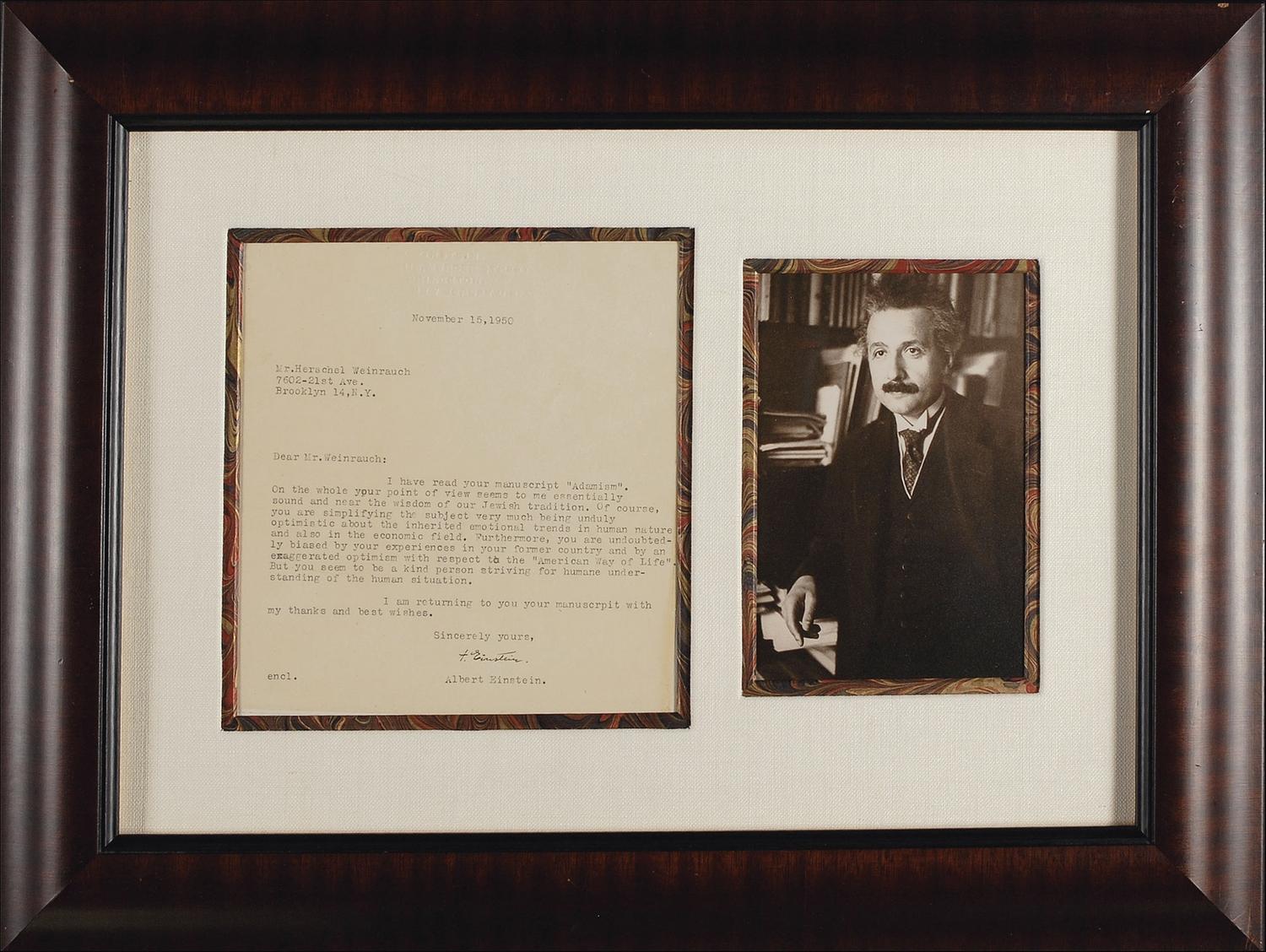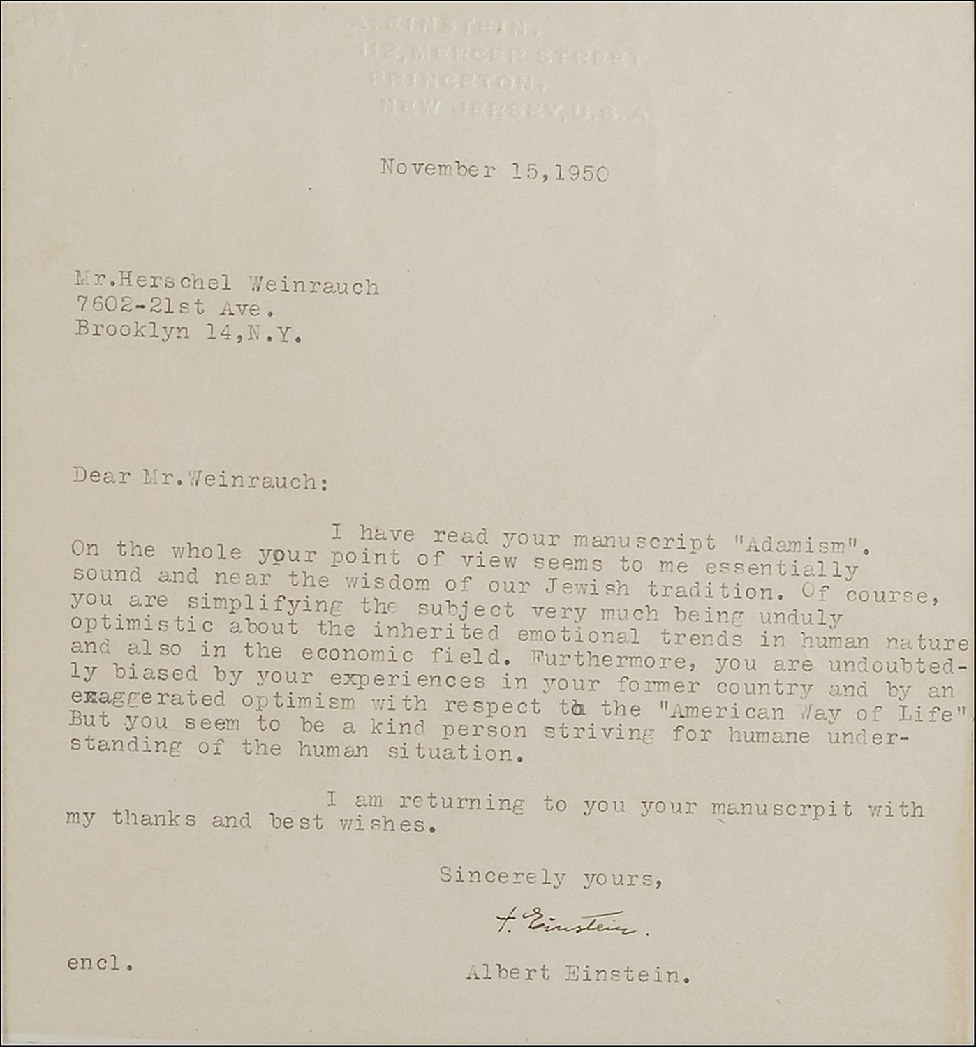TLS signed “A. Einstein,” one page, trimmed in size to 6.75 x 7.25, blind-embossed personal letterhead, November 15, 1950. Einstein replies to Soviet refugee and writer Herschel Weinrauch regarding Weinrauch’s manuscript, eventually published in 1954 under the title Adamism: The Mid-Point of Philosophy, Ideology, Politic and Religion for Today and Tomorrow. Einstein begins gently and then offers a rather strong critique. In full: “I have read your manuscript ‘Adamism.’ On the whole your point of view seems to me essentially sound and near the wisdom of our Jewish Tradition. Of course, you are simplifying the subject very much being unduly optimistic about the inherited emotional trends in human nature and also in the economic field. Furthermore, you are undoubtedly biased by your experiences in your former country and by an exaggerated optimism with respect to the ‘American Way of Life.’ But you seem to be a kind person striving for humane understanding of the human situation. I am returning to you your manuscrpit [sic] with my thanks and best wishes.” Double cloth matted with a photo to an overall size of 16.5 x 11.5. Trimming as noted, with a few light creases and wrinkles, tiny marginal tape remnant and toning along extreme right edge, an extra mailing fold, and a small unobtrusive hole at top edge, otherwise fine condition. Einstein may well be referring to McCarthyism when he mentions Weinrauch’s “exaggerated optimism” regarding the “American Way of Life.” A very vocal critic of McCarthyism, Einstein was never officially called before the House Committee on Un-American Activities, but he did play a role in its hearings. His open stand against McCarthy earned him respect among much of the public, but it also earned him greater scrutiny and considerably fattened Hoover’s FBI file on Einstein.
