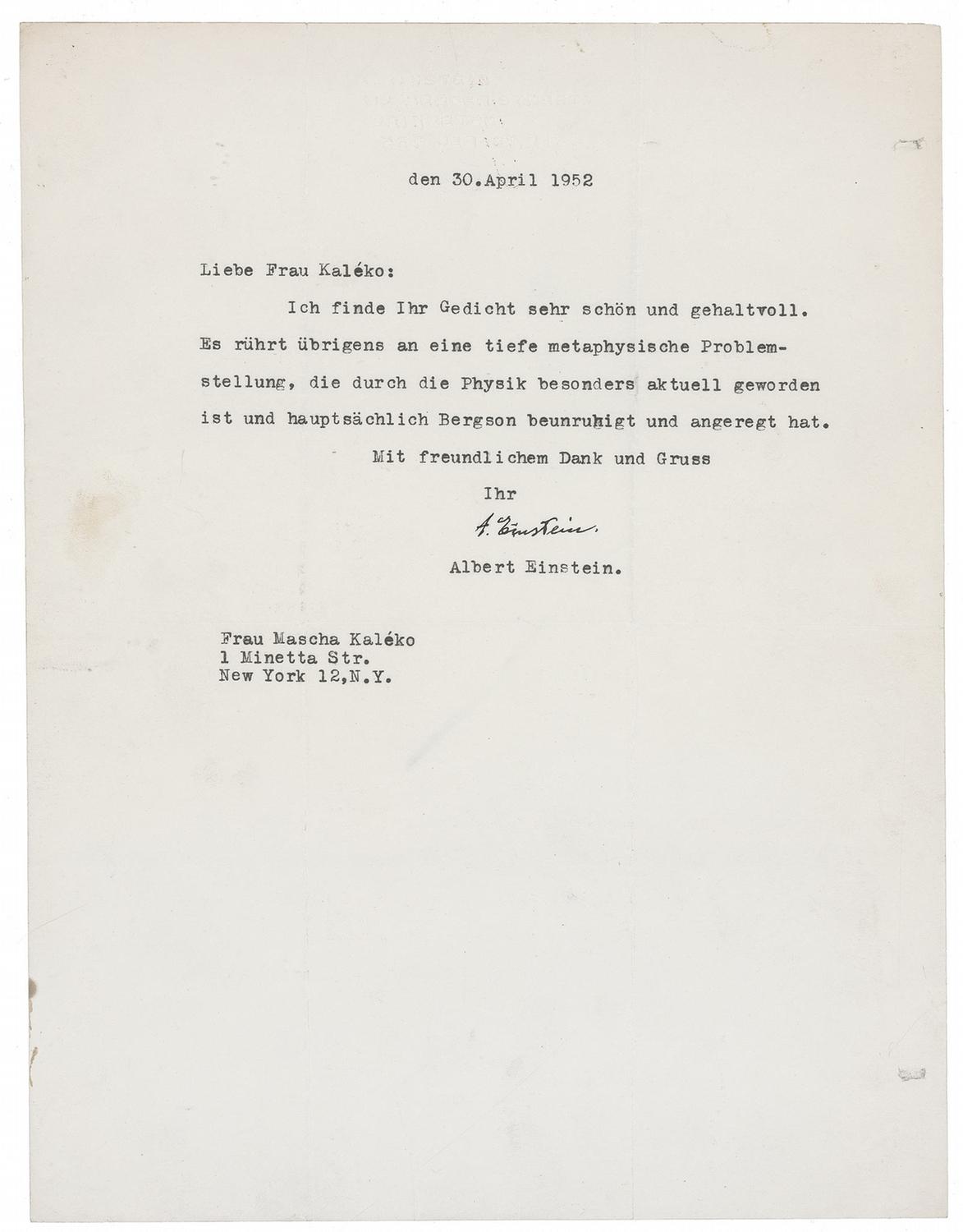 TLS in German, signed “A. Einstein,” one page, 8.5 x 11, personal letterhead, April 30, 1952. Letter to poet Mascha Kaleko. In full (translated): “I appreciate your poem as being very beautiful and indeed meaningful. Incidentally, it touches on a deep metaphysical approach to physics that has been focused on lately, and by which particularly Bergson was troubled and animated. Thanking you and sending my regards.” Intersecting mailing folds, scattered mild toning to edges, a few wrinkles, and a couple small repaired holes to right edge, otherwise fine condition. Accompanied by a full letter of authenticity from PSA/DNA.