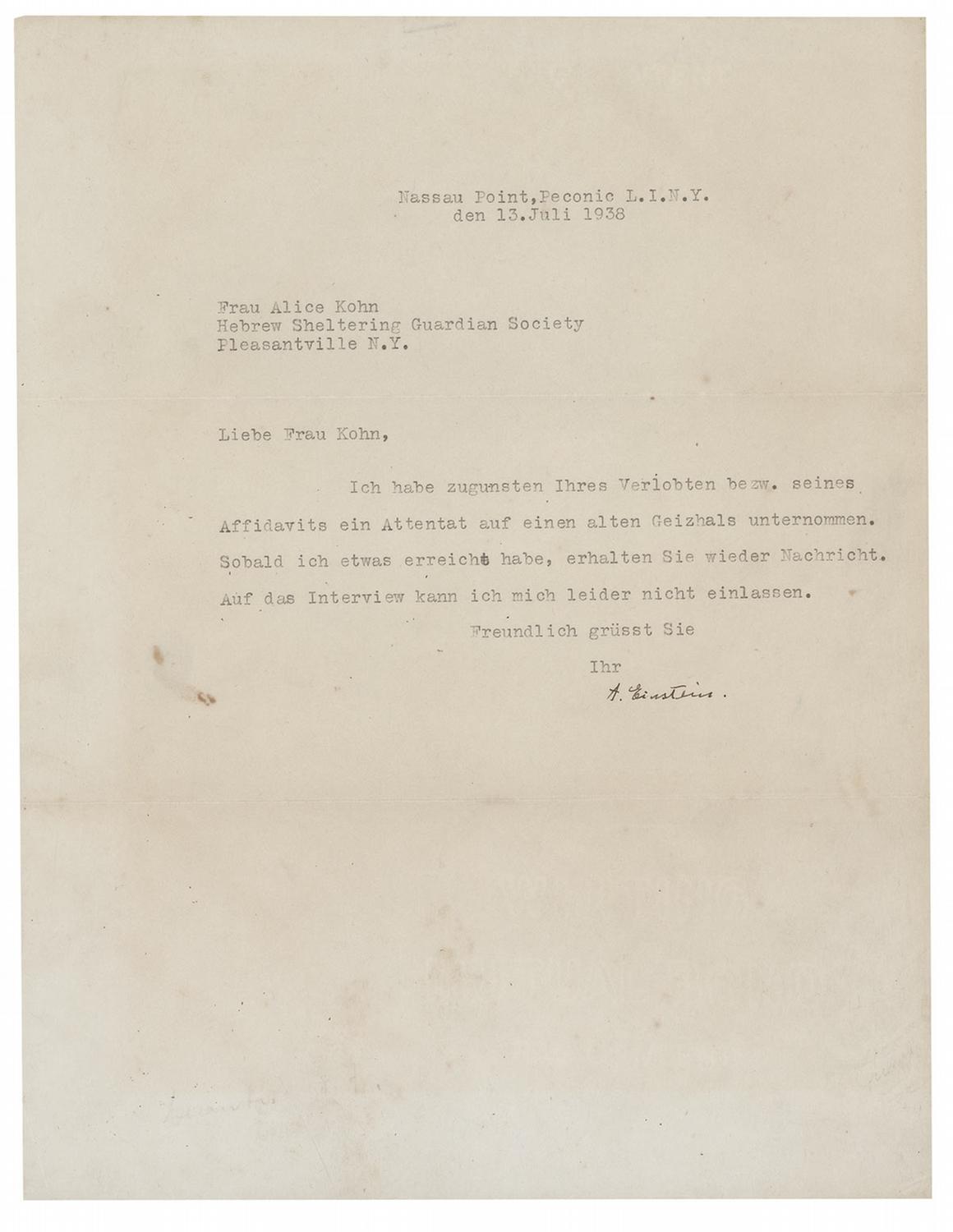 TLS in German, signed “A. Einstein,” one page, 8.5 x 11, July 13, 1938. Letter to Mrs. Alice Kohn, of the Hebrew Sheltering Guardian Society, in Pleasantville, N.Y. In full (translated): “I have in favor your fiancé respective to his affidavits on an attempt undertaken on an old miser. As soon as I have achieved something, I will send news to you. Unfortunately, I cannot get involved with an interview.” A uniform block of faint toning small stain to blank area, and some scattered light foxing and creasing, otherwise fine condition. Accompanied by the original mailing envelope.