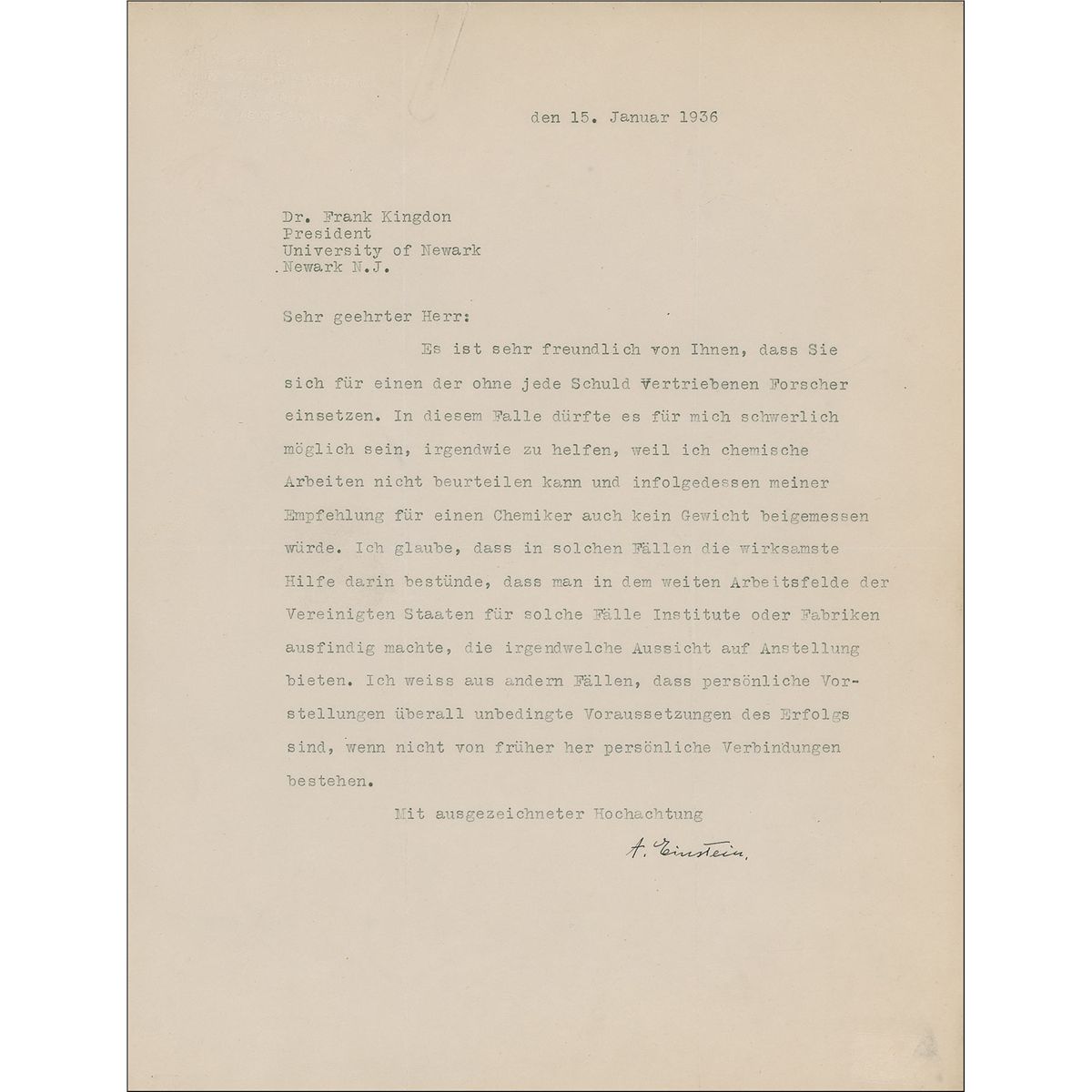 TLS in German, signed “A. Einstein,” one page, 8.5 x 11, blind-stamped personal letterhead, Princeton, January 15, 1936. Letter to Dr. Frank Kingdon, President of the University of Newark. In full: (translated): “It is very kind of you to take such an interest in a scientist who has been exiled without any fault of his. In this case, however, it is rather difficult for me to be of any assistance, since I am in no position to judge the value of research in the field of chemistry, and therefore would attach no weight to my recommendation of a chemist. I believe that in such cases the most effective aid would consist in contacting institutes and factories which are engaged in this sphere in the United States and which offer opportunities for employment. I know from other cases that personal interviews are everywhere an indispensable premise of success if there are not previous personal contacts.” In fine condition, with intersecting folds, one through a single letter of signature, and a paperclip impression to top edge. Letter is housed in a blue cloth four-fold portfolio with flaps; turkey-marbled inside left and right flaps. Labeled “Albert Einstein T.L.S. January 15, 1936 to Dr. Frank Kingdon” on spine in gilt on red label.