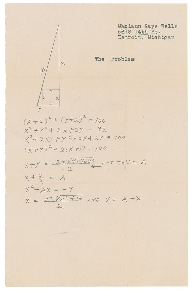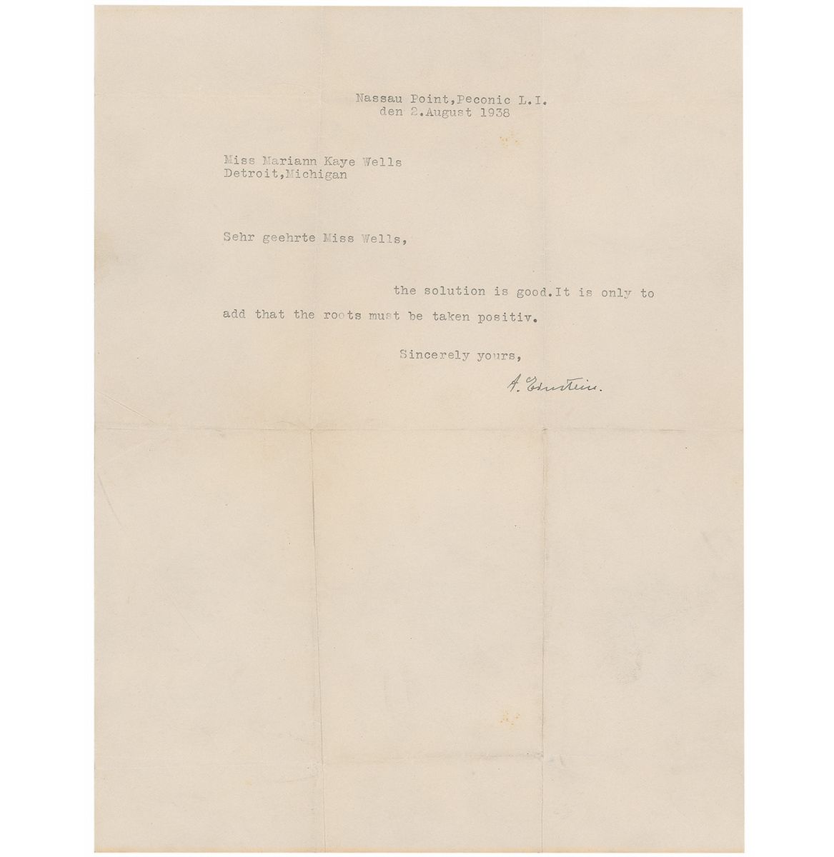 TLS signed “A. Einstein,” one page, 8.5 x 11, August 2, 1938. Einstein (who, given some minor typos, evidently took the time to type this letter himself!) gives the nod to a trigonometry solution submitted to him by a curious student. In full: “the solution is good. It is only to add that the roots must be taken positiv [sic].” In fine condition, with intersecting folds, one passing through the middle of the signature, and light toning. Accompanied by the original mailing envelope and ‘The Problem,’ drawn out in pencil, to which Einstein was responding. A unique example, for any Einstein enthusiast!