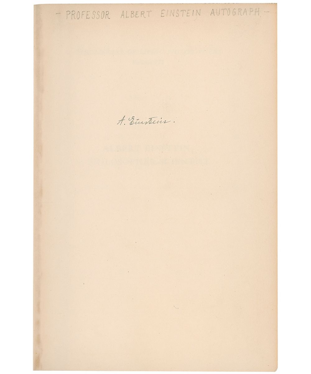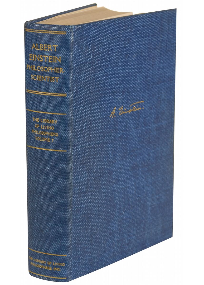 Signed book: Albert Einstein: Philosopher–Scientist. First edition. Evanston, Illinois: Library of Living Philosophers, Inc., 1949. Hardcover, 6.5 x 9.25, 781 pages. Crisply signed on the first free end page, “A. Einstein.” In fine condition, with pencil notation along top of signed page, a mild shade of toning, and some light toning to pastedowns.