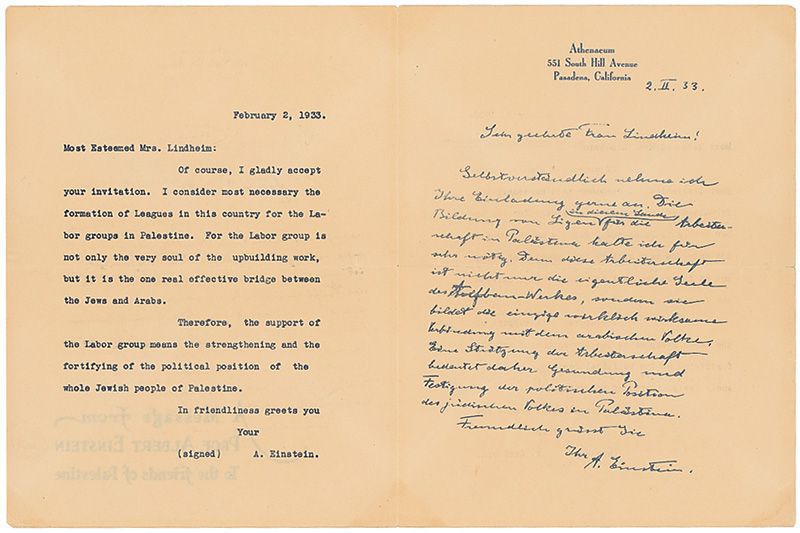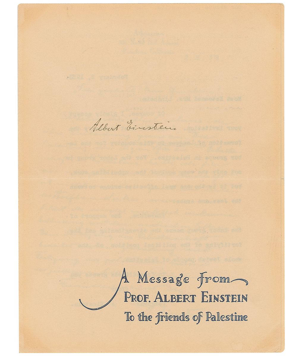 Printed message, signed “Albert Einstein,” two pages on two adjoining sheets, 6 x 8, entitled “A Message from Prof. Albert Einstein to the Friends of Palestine.” The interior has a printed letter written in German in Einstein's hand on the right side with a typed translation on the left. The letter, dated February 2, 1933, to Irma Levy Lindheim, former president of Hadassah, reads, in full: "Most Esteemed Mrs. Lindheim: Of course, I gladly accept your invitation. I consider most necessary the formation of Leagues in this country for the Labor groups in Palestine. For the Labor group is not only the very soul of the upbuilding work, but it is the one real effective bridge between the Jews and Arabs. Therefore, the support of the Labor group means the strengthening and the fortifying of the political position of the whole Jewish people of Palestine.” Signed on the front in black ink by Einstein. A central horizontal fold, mild toning, mainly to edges, and a few trivial edge separations, otherwise fine condition. It is interesting to note that this letter was written only three days after Hitler took over power in Germany. This prompted Einstein to move his family permanently to the United States, eventually settling in Princeton, New Jersey. Hitler made it known that Einstein would have been a primary target had he been in Germany during this time. Prior to this move, Einstein participated in several visiting professorships at various universities in the States. This letter was written during one such visit to the California Institute of Technology.