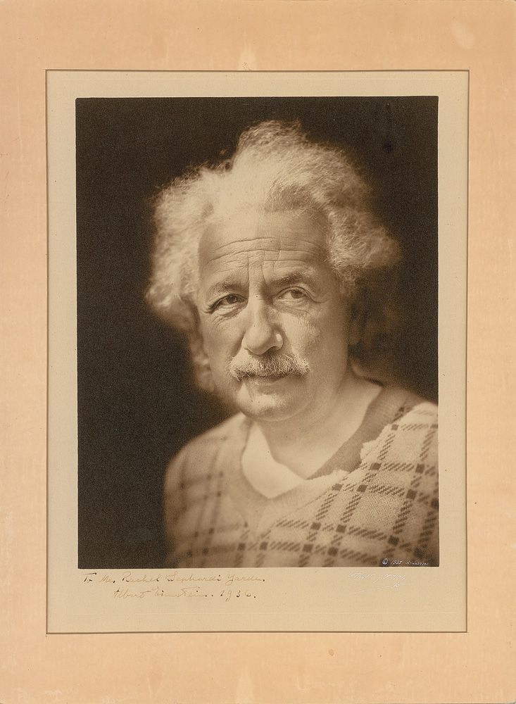 Vintage matte-finish 8.25 x 11 photo of Einstein bathed in soft light, taken by Arthur Johnson circa 1935, signed and inscribed in the lower border in fountain pen “To Mrs. Rachel Sephardi Yarden, Albert Einstein 1936.” Photo also bears a white ink photographer’s notation to lower right. Photo is matted to an overall size of 10.25 x 14. In fine condition, with Einstein’s signature and inscription fairly light, but still completely legible. A great casual image of Einstein, with a copy of this exact Johnson portrait displayed in the National Portrait Gallery in Washington, D. C.