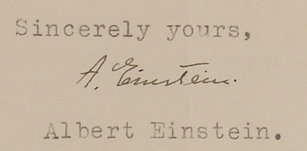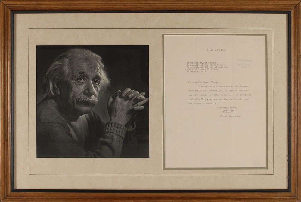 TLS signed “A. Einstein,” one page, 8 x 10.5, blind-stamped personal letterhead, October 24, 1950. Letter to Dr. Max Thorek, International Secretary General of the International College of Surgeons. In full: “I accept with sincere thanks the Honorary Fellowship the International College of Surgeons was kind enough to bestow upon me. I am convinced that with this gracious gesture you do not incur any danger to humanity.” Double-matted and framed with a casual portrait of Einstein to an overall size of 23.75 x 16. In fine condition, with intersecting folds, one through a single letter of signature, and light show-through from a notation and a Max Thorek stamp on reverse.